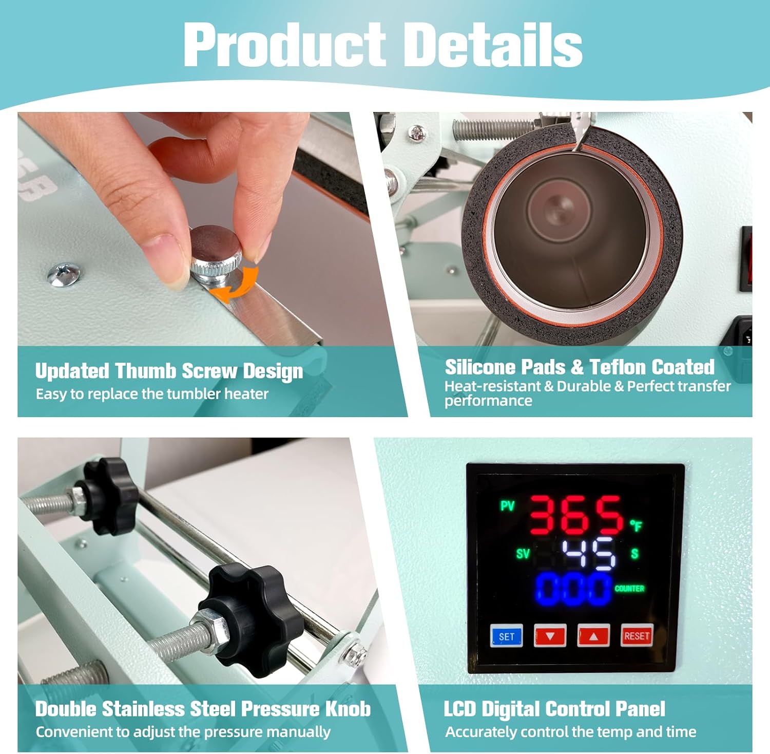 Easy To Use This tumbler heat press is easy to operate. You can adjust the double pressure knob for more even pressure and replace the heater by twisting the screws manually. It's suitable for DIY workshop and business.