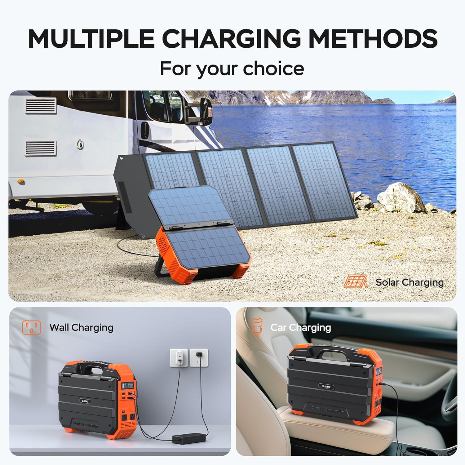 4 Charging Methods + LCD Display Recharge your solar powered generator via wall outlet car socket built-in 40W solar panel or external solar panels. The advanced 100W USB-C port supports two-way fast chargingperfect for quickly powering laptops tablets and smartphones or recharging the station itself. The clear LCD display tracks input/output power and remaining battery. Fixed handle and foldable stand make it a reliable camping power station