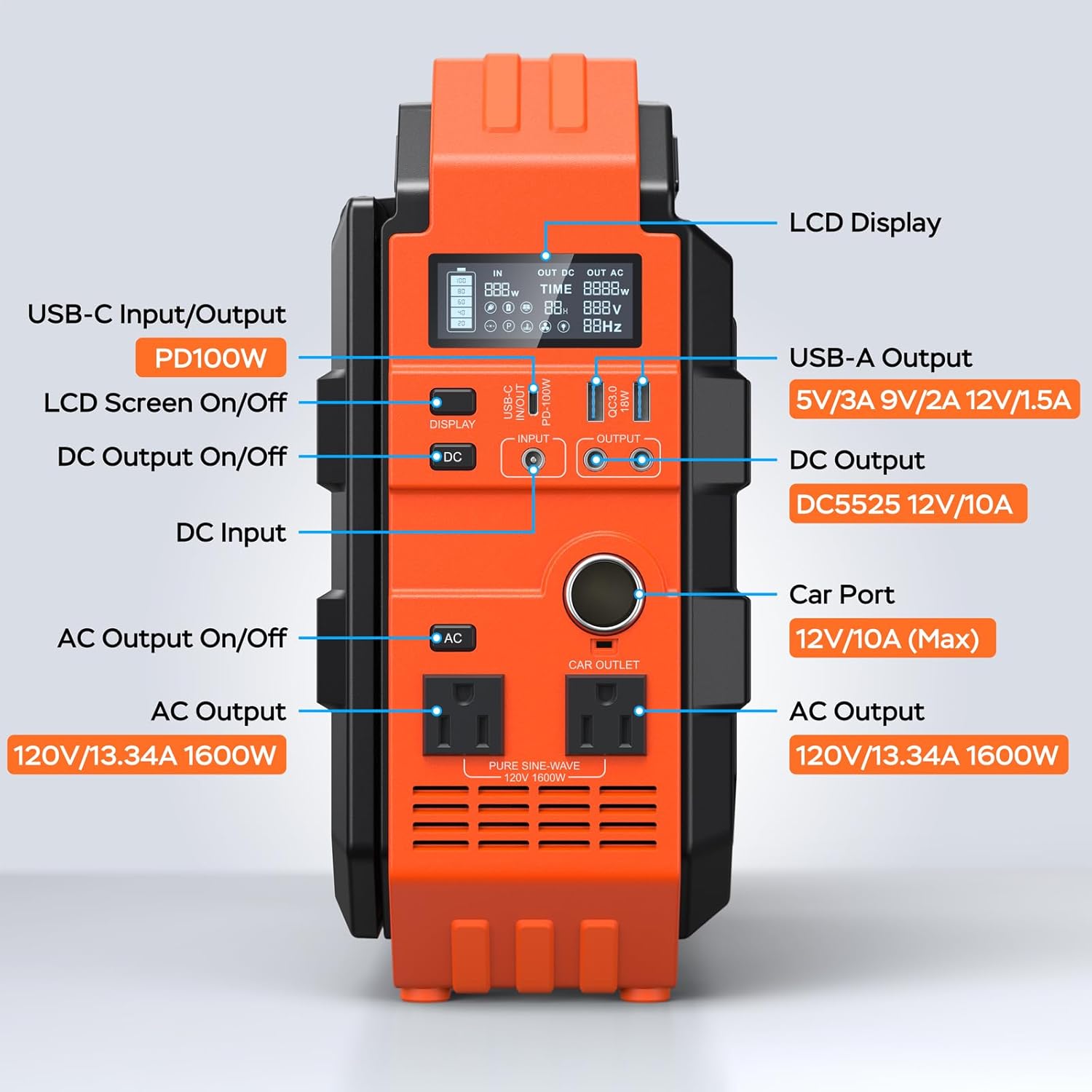 1024Wh Large Capacity & 1600W Output This 1024Wh portable solar power station delivers 1600W rated output (3200W surge) enough to run 90% of your appliances. Perfect as a home backup battery or camping power station it can power coffee makers CPAP machines refrigerators and more. With 8 versatile outlets this solar generator for home and outdoor use keeps multiple devices running simultaneously