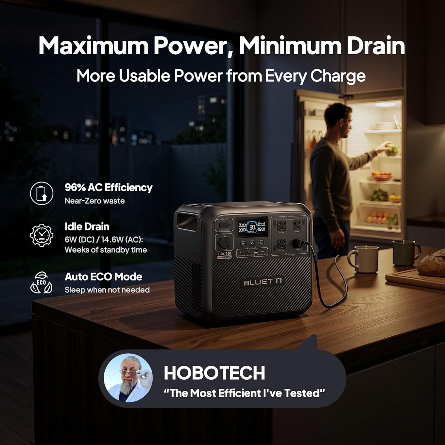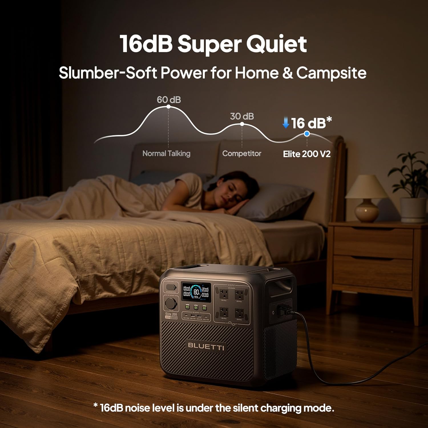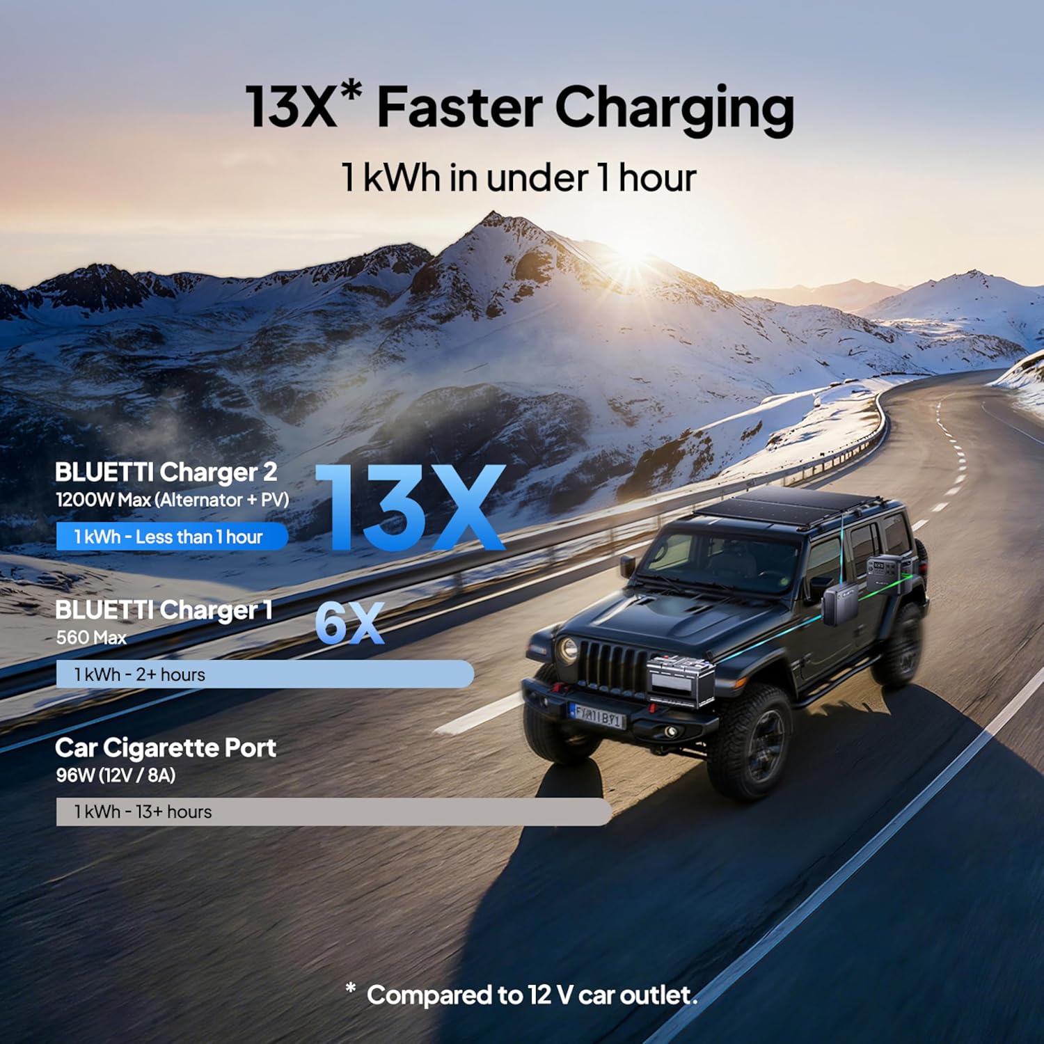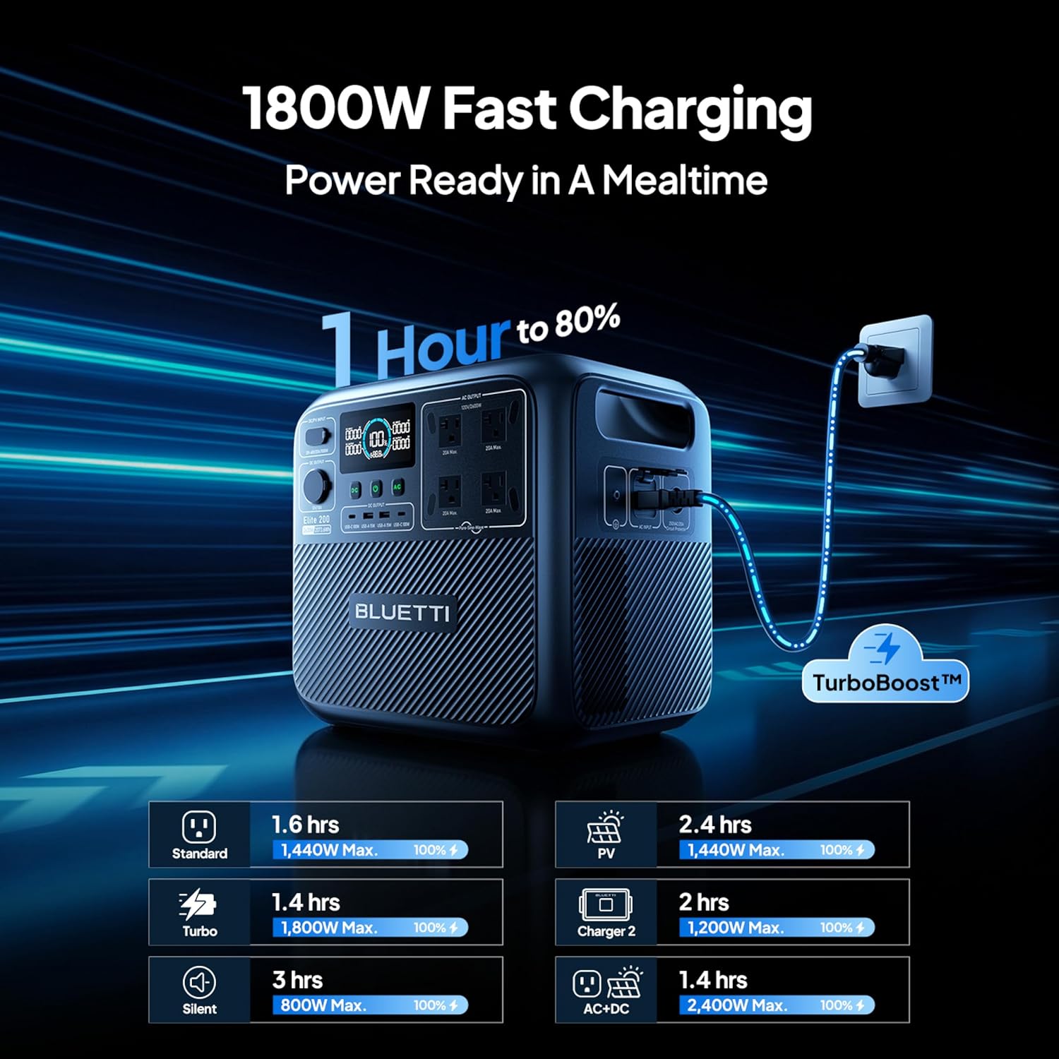 [Ultra-Fast & Smart Recharging] - Equipped with TurboBoost fast charging and an AI-optimized BMS. Elite 200 V2 support multiple charging opitions for faster safer and more efficient making it perfect for RV camping and home backup Recharge from 080% in just 50 minutes with dual AC and DC charging or achieve a full charge in 2 hours with charger 2 1200W alternator charging that's 16 faster than a standard car socket solar full charge in 2.4 hours with 1000W panels.