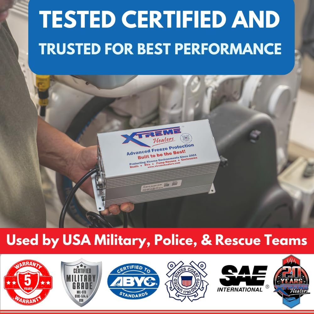 Stay Safe > Our freeze protection heater is made for harsh enclosed engine compartments. Exceeding Coast Guard ABYC & MILSPEC certifications for heat cold moisture & vibration. Our heaters have been in boats rvs etc for over 20 years now keeping them protected!