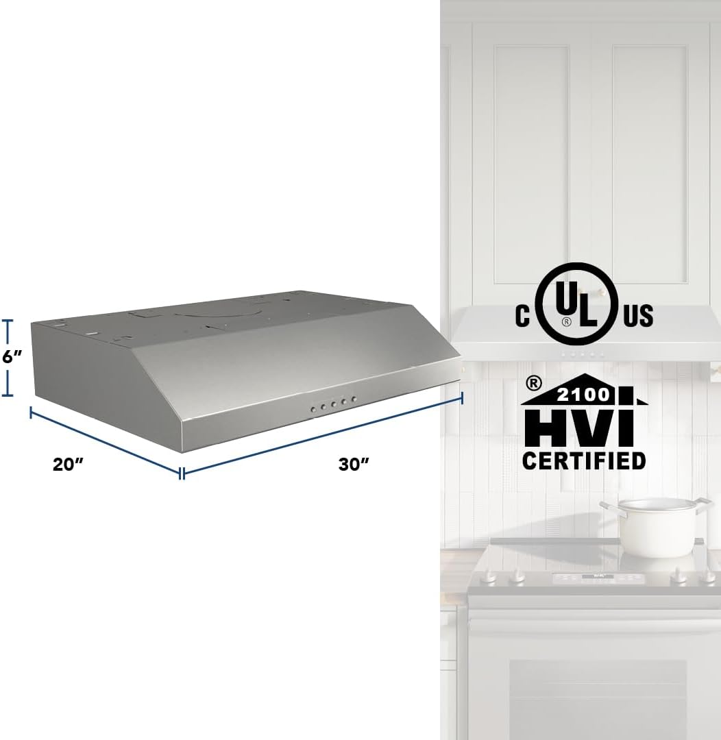Upgrade your kitchen with the Glacier 30-inch Under-Cabinet Convertible Range Hood! This versatile range hood insert offers a complete solution to your ventilation needs by providing both an exhaust fan and overhead light for your stove. This range hood provides a MAX 375 CFM and 5.5 Sones blower performance to quickly remove smoke and cooking odors from the air and the 3-speed push button controls allow for quick fan adjustments and provides the ideal level of ventilation every time you cook. It also features the Captur system - an advanced blower design with a forward positioned centric inlet to remove 97.4% of smoke and odors faster. The bright single-intensity LED module evenly illuminates your cooking area and it is also controlled by a push button for ease of use. This sleek stainless steel range hood fits neatly underneath cabinets and it features mitered sides and a hemmed bottom with no sharp edges to help ensure safety and provide a more decorative look. The two one-piece dishwasher-safe open mesh grease filters offer easy cleaning so you can maintain optimum grease capture and keep your kitchen ventilated. This 4-way convertible range hood unit measures 19.625" x 30" x 6" and installs as 3.25" x 10" ducted opening connected vertically or horizontally with damper 7" round vertical ducting (damper sold separately) or as non-ducted with air recirculation (filter sold separately) to provide versatile installation options at least 18" above the cooktop. It includes hidden louvers on top of the hood that exhaust away from the cabinetry. It can work in an ADA-compliant application as well. It is both UL-Listed and HVI-2100 Certified for safety and protection and it includes a 1 year limited warranty and a 3 year limited warranty on the LED module. Enhance your kitchen with the BCSQ130SS Range Hood!