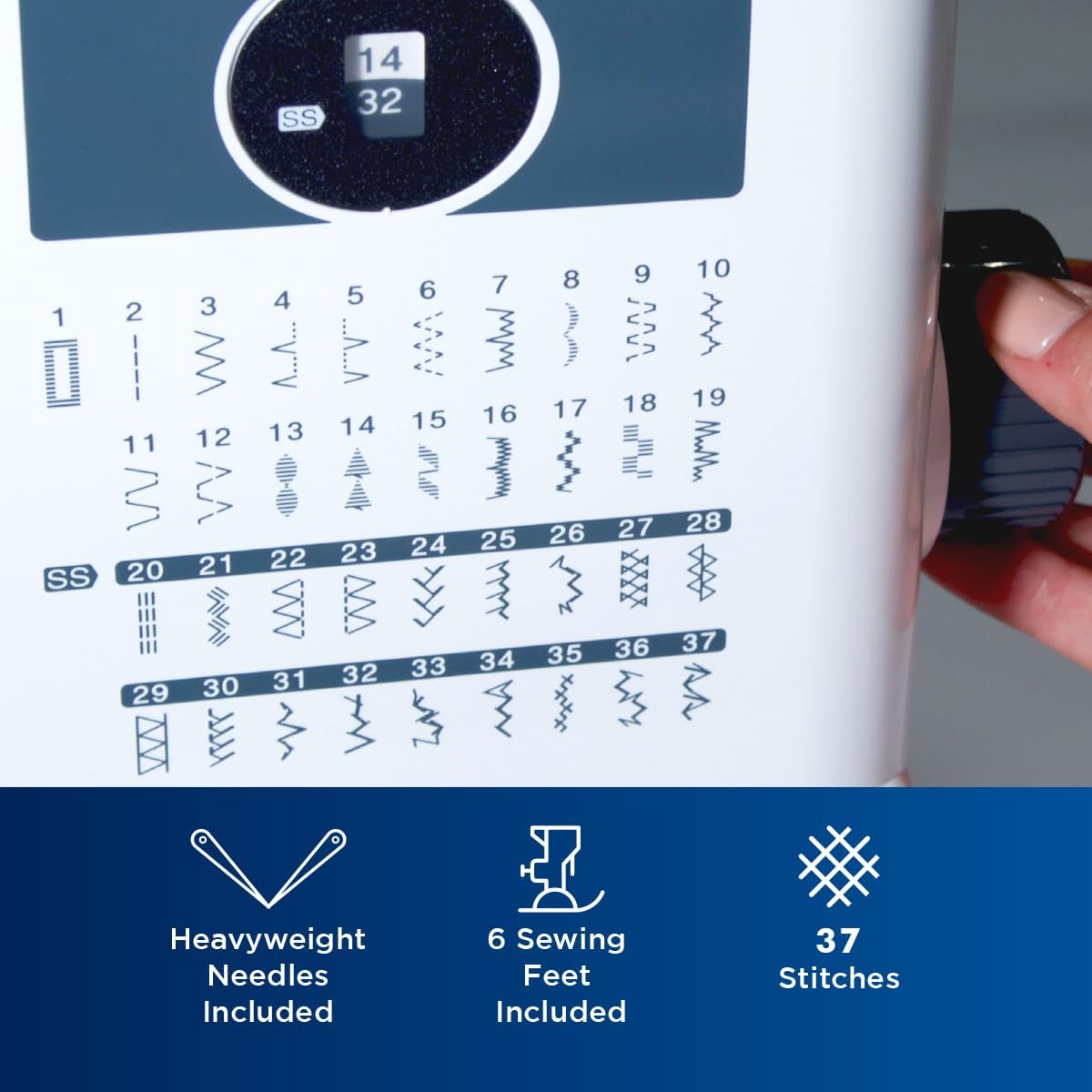 The ST371HD comes complete with 6 sewing feet including a spring action zigzag foot and nonstick blind stitch zipper buttonhole and button sewing feet. Additionally the drop feed feature allows you to complete free-motion sewing with ease. This heavy-duty sewing machine also has a built-in easy needle threader a jam-resistant Quick-Set drop-in top bobbin an automatic bobbin winding system and a free arm for sewing cuffs sleeves and jeans.