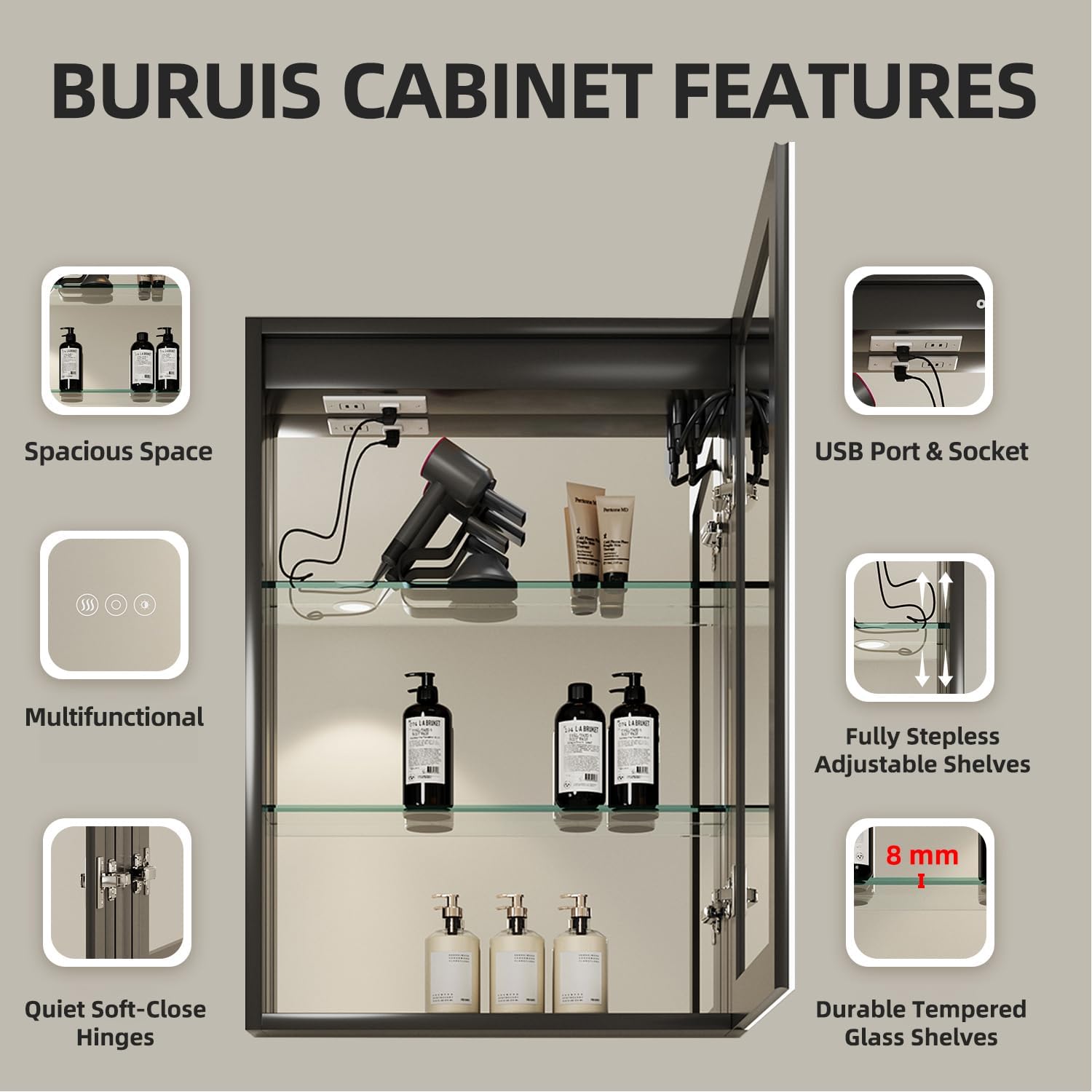 Fully Adjustable & Removable Shelves: Made with 8 mm ultra-clear tempered glass the stepless shelf system provides fully adjustable height settings to fit items of all sizes and the shelves can be removed effortlessly for flexible storage and easy cleaning