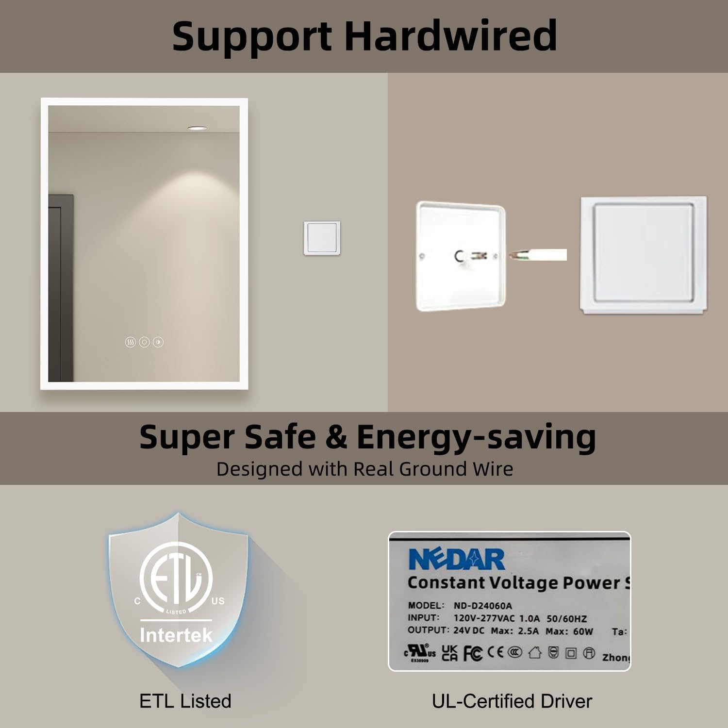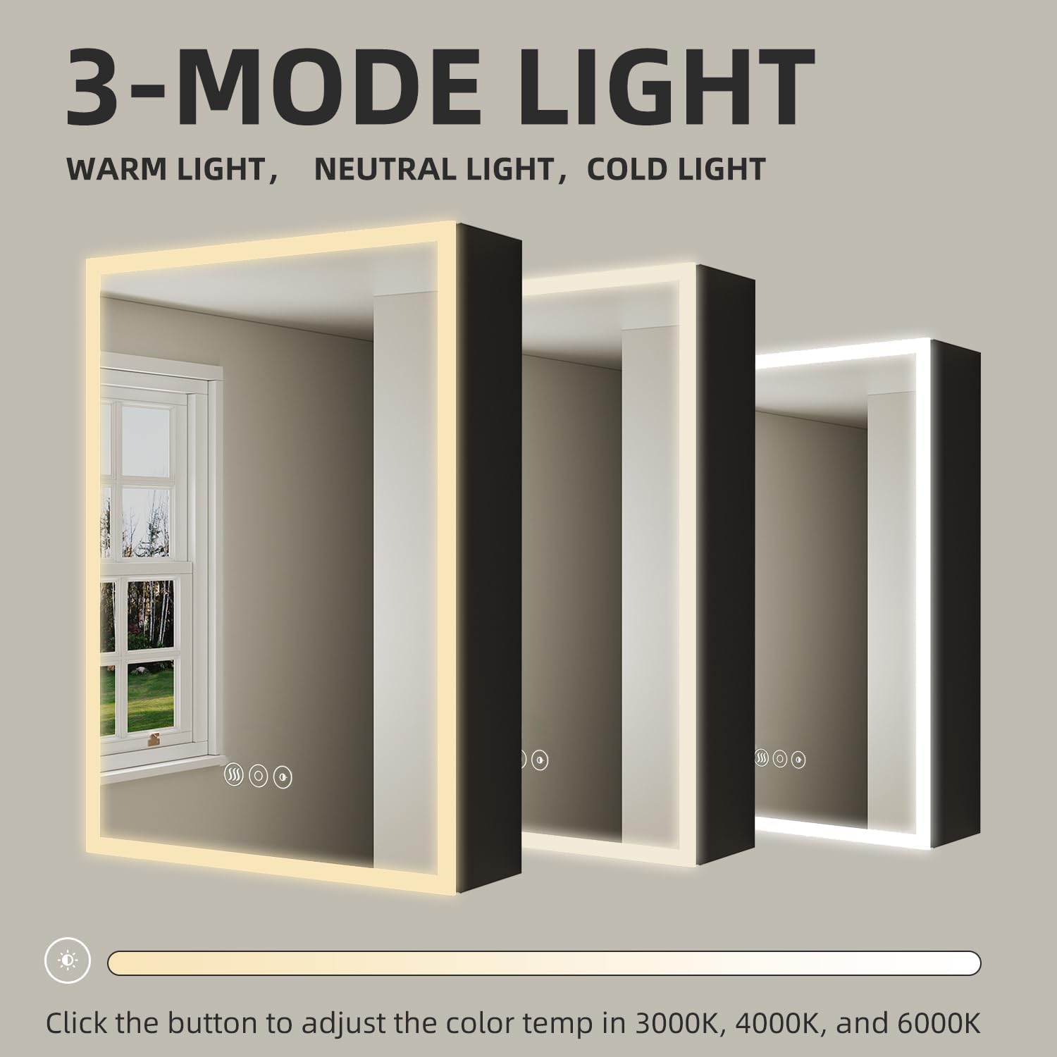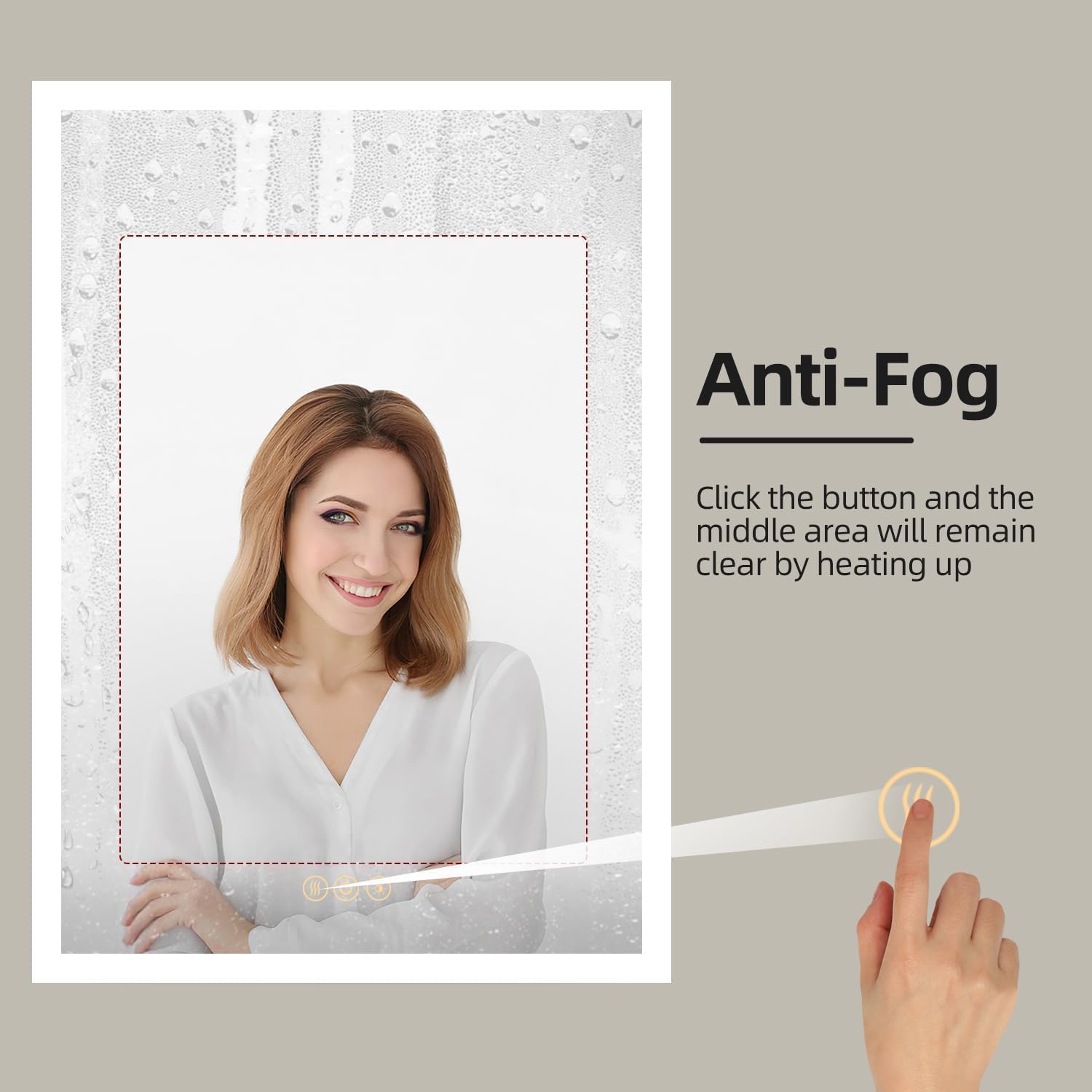 Anti-fog Function: The heating defog function is practical and power-saving. Click the first button (button 1) to turn on/off the function the middle square area will heat up to defog and keep the mirror clear. It turns off after 1 hour automatically