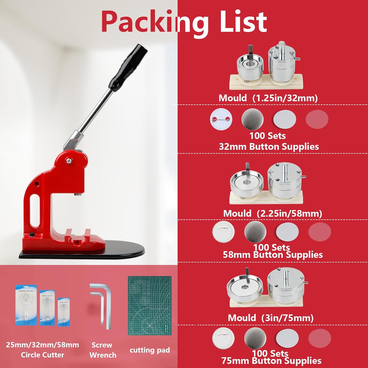 Sturdy and Durable Button Machine for All SizesOur button press machine kit comes with 2 replaceable button-models 32mm and 58mm to meet your needs of different sizes. You can also buy button-models of other sizes to install and use separately. With this button making machine you own the button world.