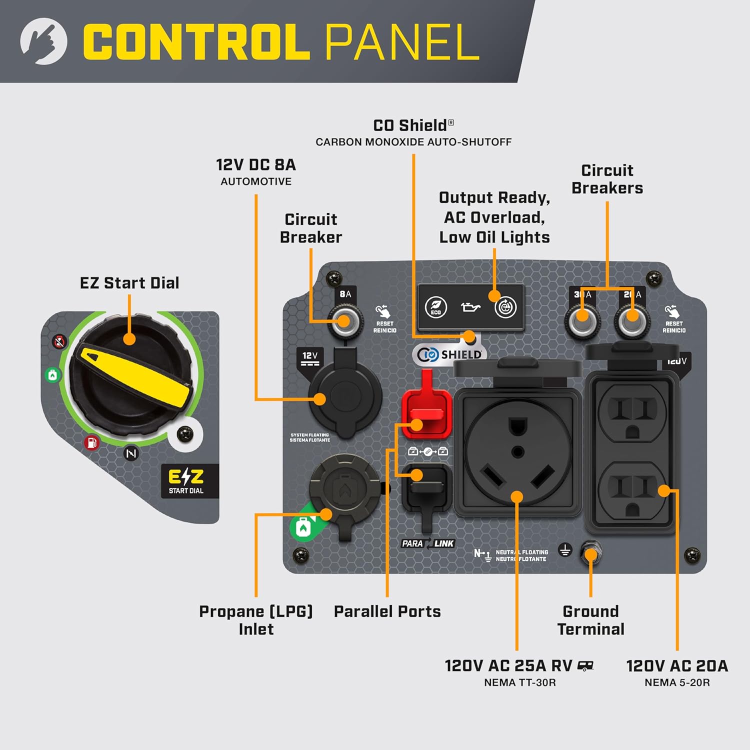 Includes a 120V 25A TT-30R outlet a 120V 20 A household duplex outlet (5-20R) with clean electricity (less than 3% THD) plus a 12V automotive-style outlet and Parallel outlets