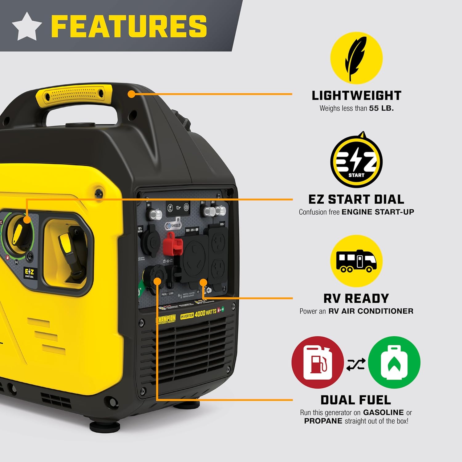 The optional sold-separately parallel kit enables this inverter to connect with another Parallel Ready Champion Inverter or Power Station for more power and longer run time
