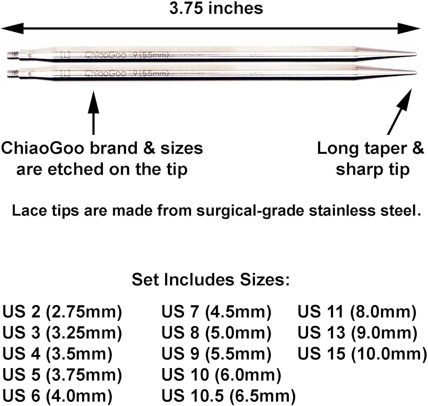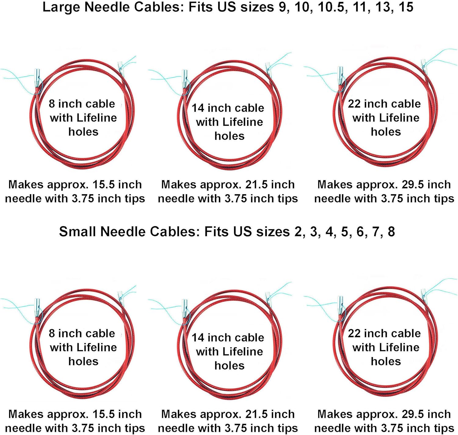 Set includes 3 for Small needles and 3 for Large needles: 8" (20cm) 14" (35cm) and 22" (55cm); 2 cable connectors (1 of each of Small & Large) 4 End Stoppers (2 each of Small & Large)