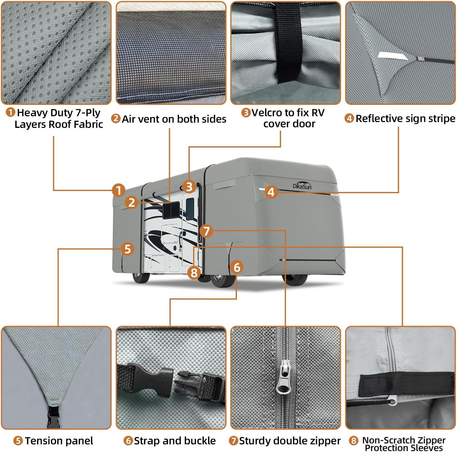 Easy installation & VentilationIntegrated undercarriage strap system with toss sticks is easy to remove and install. 6 air vents can enhance the airflow of the top cover along the roof line play the role of ventilation and moisturizing balance the air pressure inside and outside the camper cover on windy days. Breathable material to maximize the evaporation of moisture under the camper cover and prolong the service life.