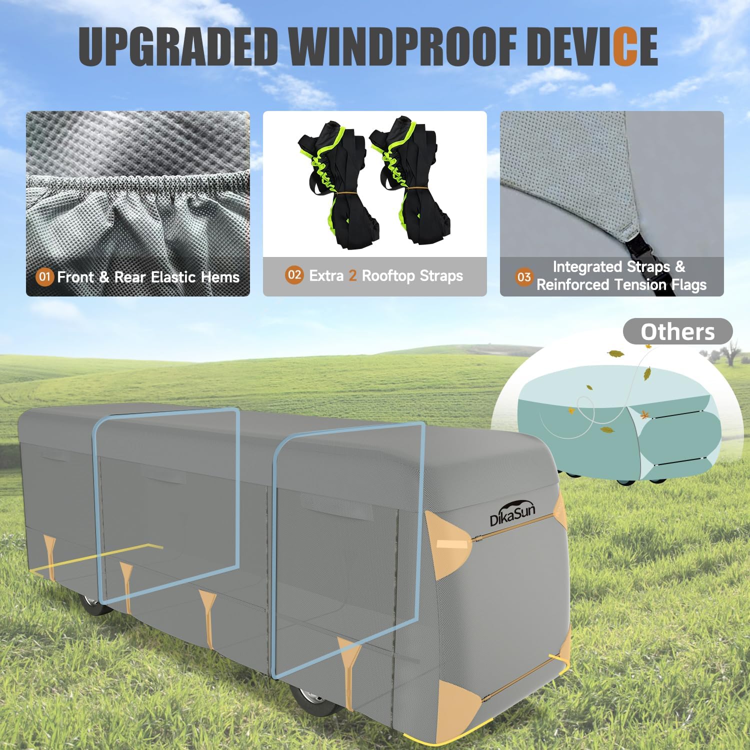 Windproof UpgradedAdjustable front and rear tensioning panels and elasticized hem provide a custom fit for your Class A motorhome cover. 2 additional all-around straps are specially designed to better protect the rv cover from being blown away and torn by heavy winds. And it's also the best RV Cover for winter and snow
