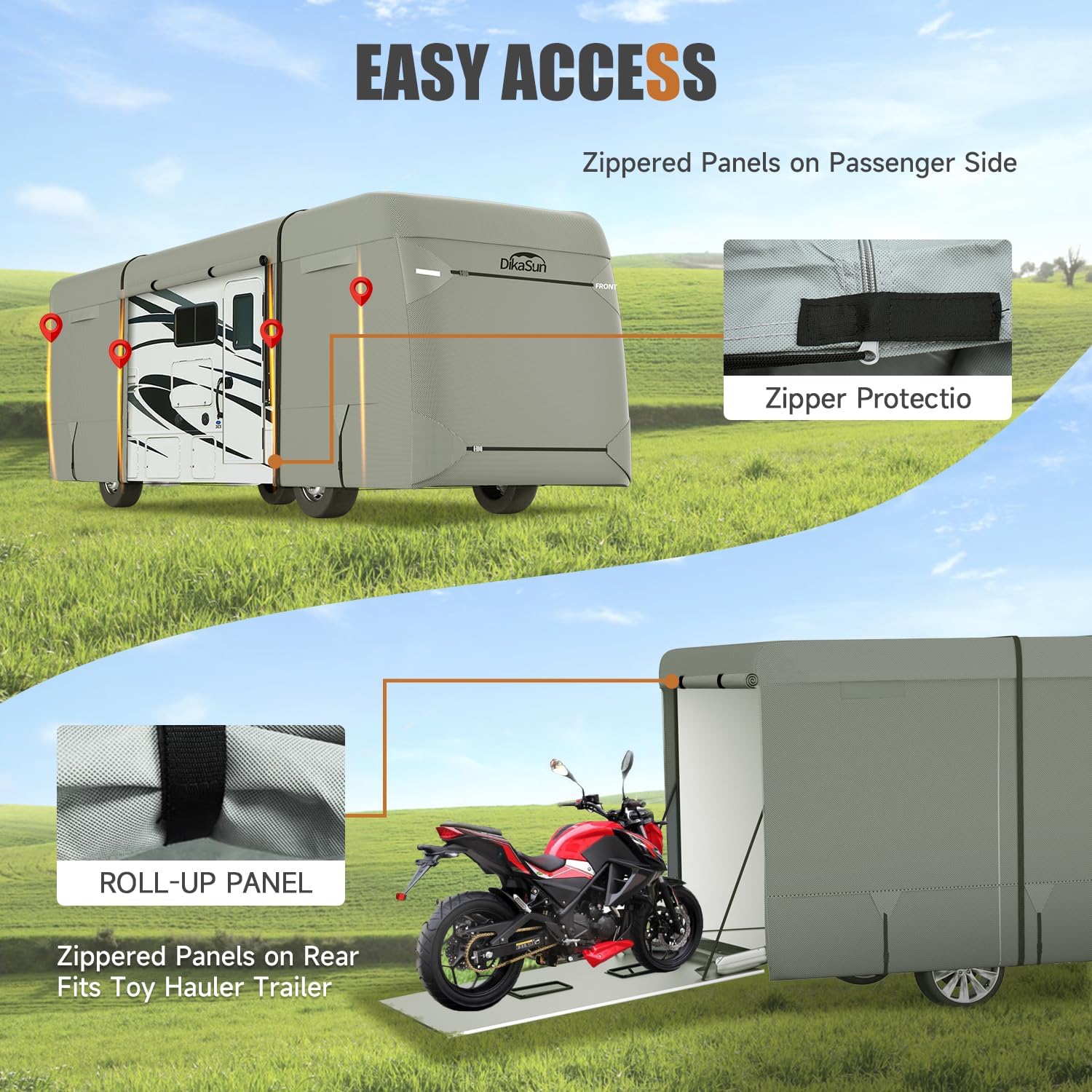 Windproof UpgradedAdjustable front and rear tensioning panels and elasticized hem provide a custom fit for your Class A motorhome cover. 2 additional all-around straps are specially designed to better protect the rv cover from being blown away and torn by heavy winds. And it's also the best RV Cover for winter and snow