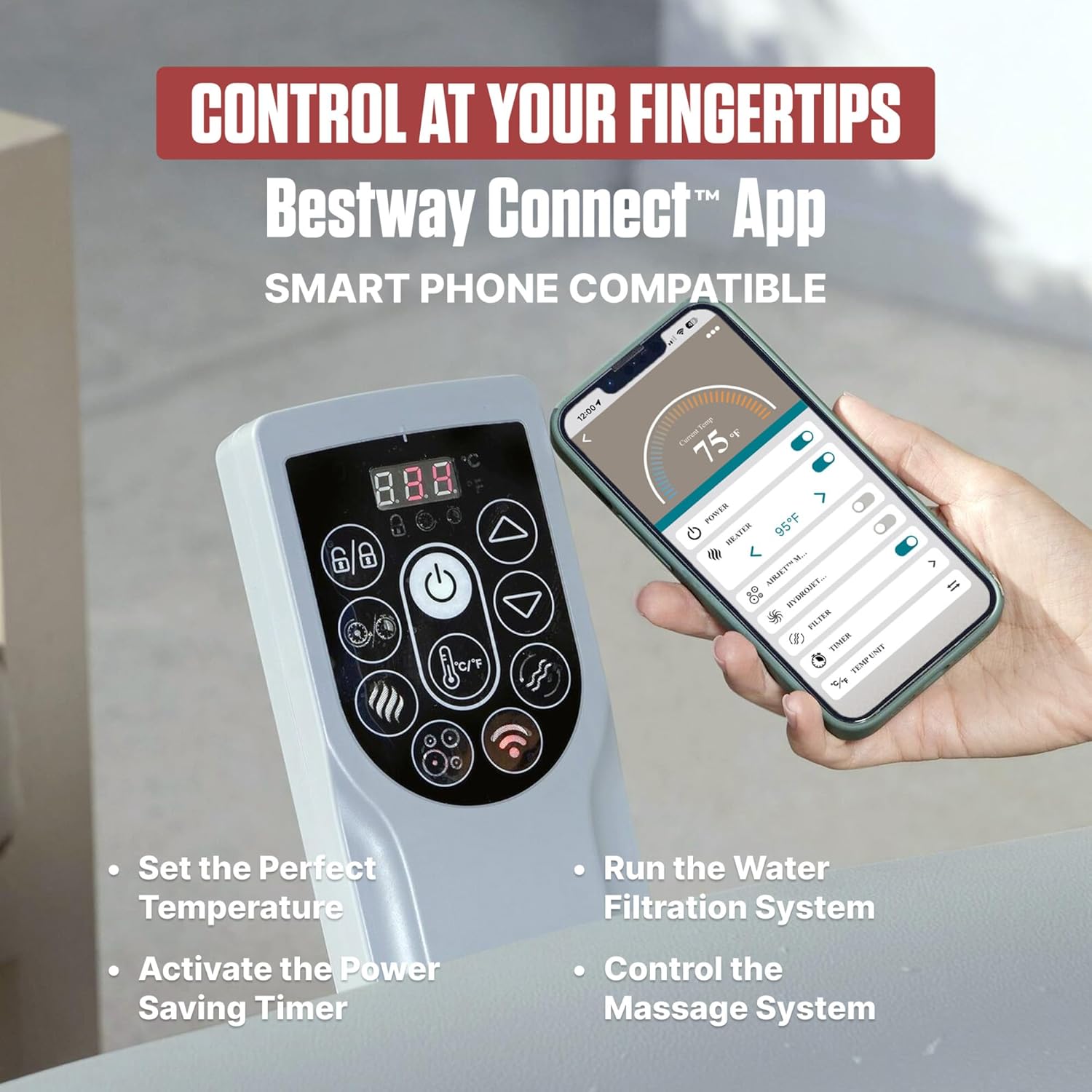 Control at Your Fingertips: Compatible with the Bestway Connect app that allows you to control the temperature timer filter and massage system from the palm of your hand. The Power-Saving Timer allows you to control the temperature of the water up to 40 days in advance.