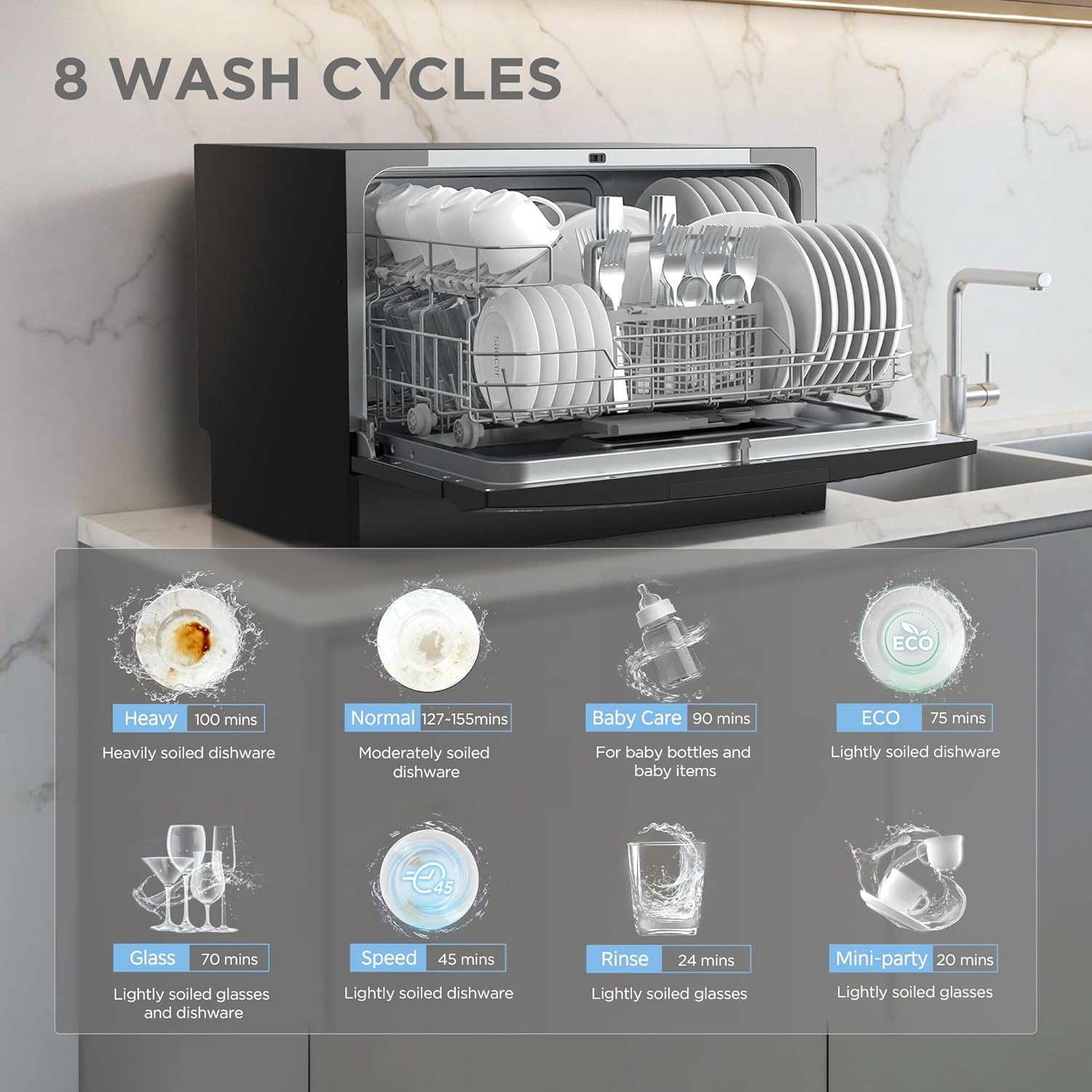 8 Washing Cycles- Most of the cleaning cycles including Heavy Normal Baby-Care ECO Glass and Speed helped with extra-drying function and deliver sparklingly cleaned and dried dishes. Three more cleaning options including Speed Mini-party and Rinse are designed for compact dishwasher providing high flexibility for you to choose in different situations.