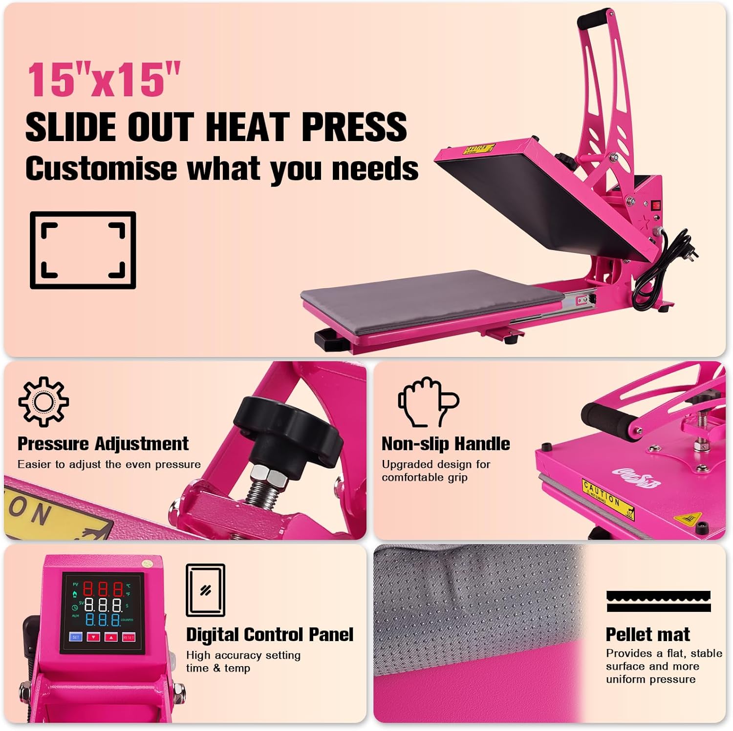 UPGRADE SLIDE OUT HEAT PRESSThe heat transfer machine features an upgraded sliding base plate that allows the machine to work easier and more efficiently reducing the chance of accidental contact when transferring clothes making it ideal for homes and businesses