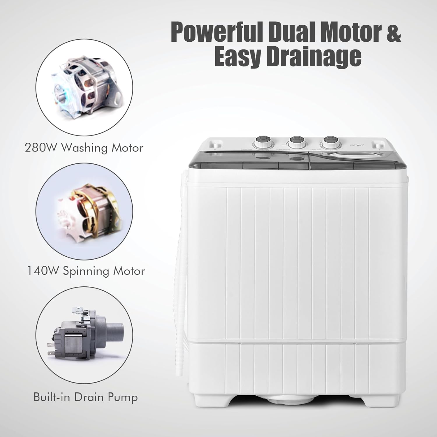 [Durable Motor] Thanks to the powerful motor you can wash your clothes quickly and efficiently. It runs quietly without disturbing the neighbors. 280W washing power and 140W spin power ensure continuous output and prolonged durability.