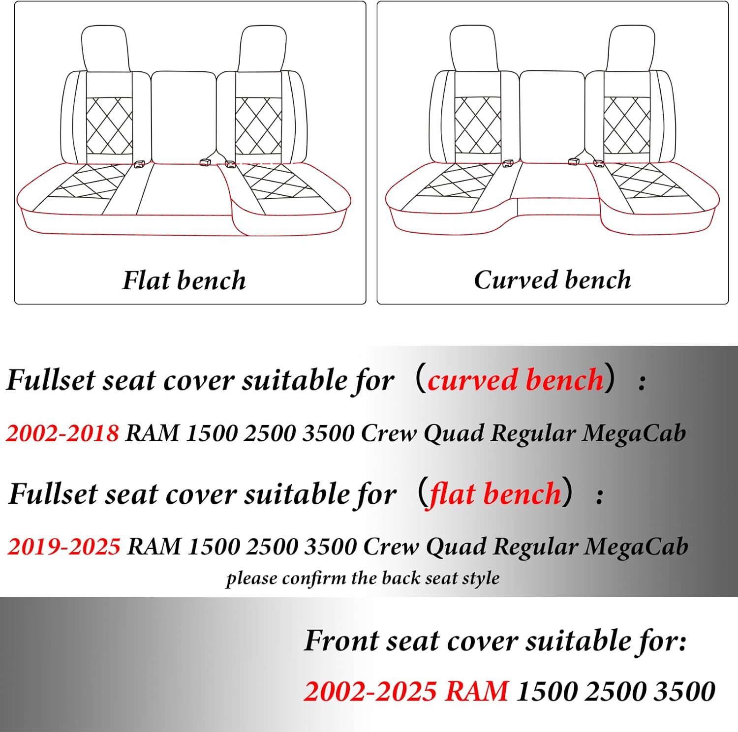 PACKAGE CONTENTS: Each set includes front seat cover (including centre armrest cover) rear seat cover. A complete set of car interior seat covers. And ram 1500 seat covers can easily be cleaned by wiping with a towel. Various colors to select from you can define a new look for you car as you like