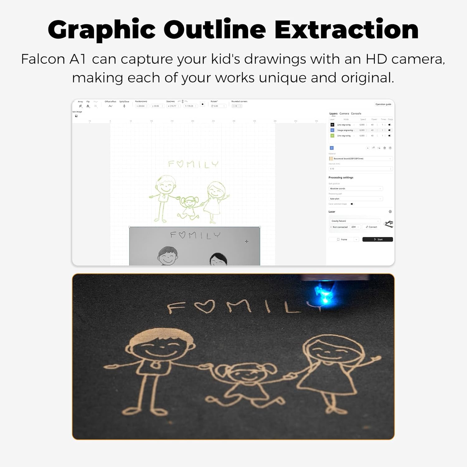 Self-developed Engraving SoftwareThe Falcon software offering various editing functions to make your projects truly unique versatile editing for all design levels. Its free smart and easy for anyone to start their creative journey effortlessly. And our machine also supports popular software like LightBurn LaserGRBL and Cutlabx.