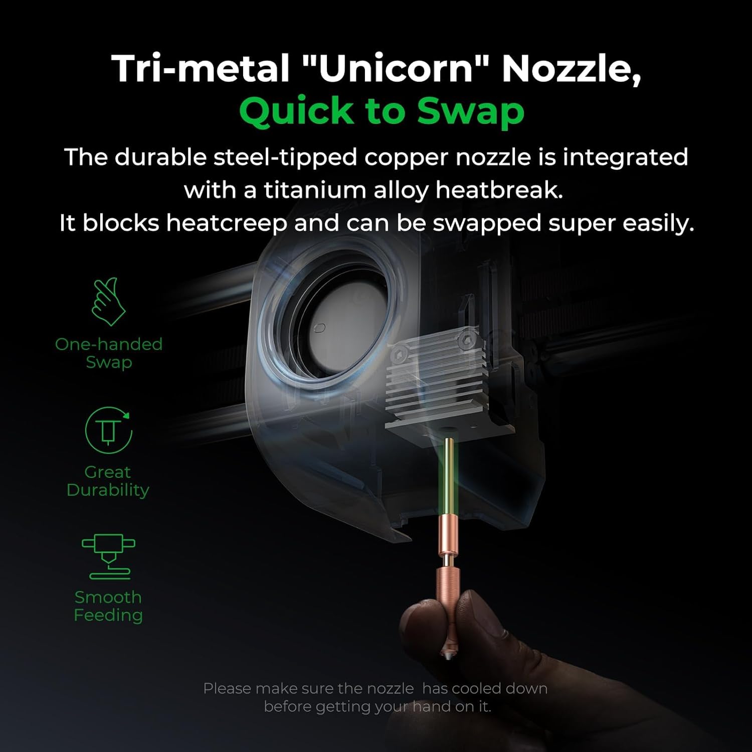 Clog-free Direct Extruder & Tri-metal "Unicorn" Nozzle K1C is an upgraded version of K1 SE K1 and K1 Max. It has more powerful functions and supports printing carbon fiber filaments. K1C 3d printer equips a clog-free robust direct extrude enhanced with a bolster spring and a ball plunger.It forms a strong grip enhanced reliability that won't slacken off. Steel-tipped copper nozzle integrated with a titanium alloy heatbreak.It is free of clogs and can be swapped quickly.