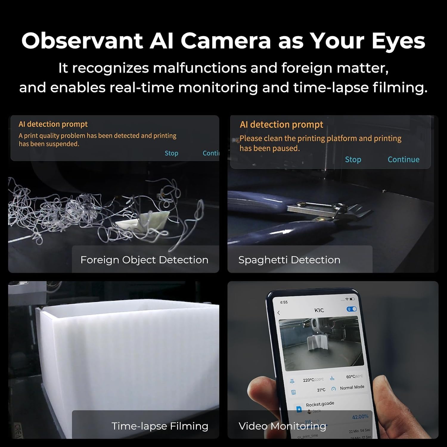 K1C with AI CameraK1C is equipped with an AI camera as standard. It can always monitor whether there are foreign objects or malfunctions during the printing process. and enables real-time monitoring time-lapse photography functions.