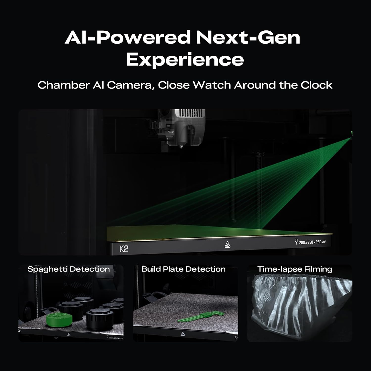 Smarter Printing Safer ExperienceStay in control with the AI Chamber Camera for failure detection time-lapse recording and build plate monitoring. The built-in air purifier filters VOCs while Wi-Fi connectivity and 8G local storage make printing faster safer and smarter than ever.