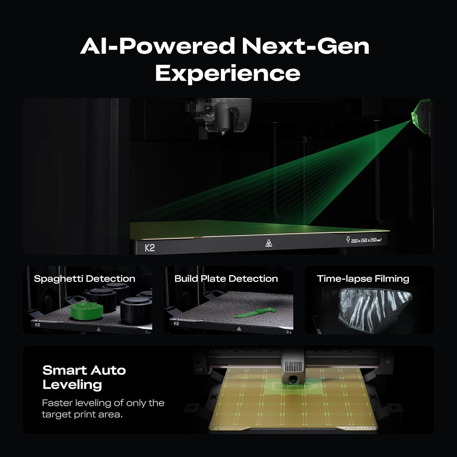 Smart Auto Leveling & AI Camera: Faster leveling of only the target print area. The leveling sensor only probes and levels the bed area relevant to the desired print. Much faster and more precise. Close watch around the clock Watch over spaghetti failure idling and so on in real-time