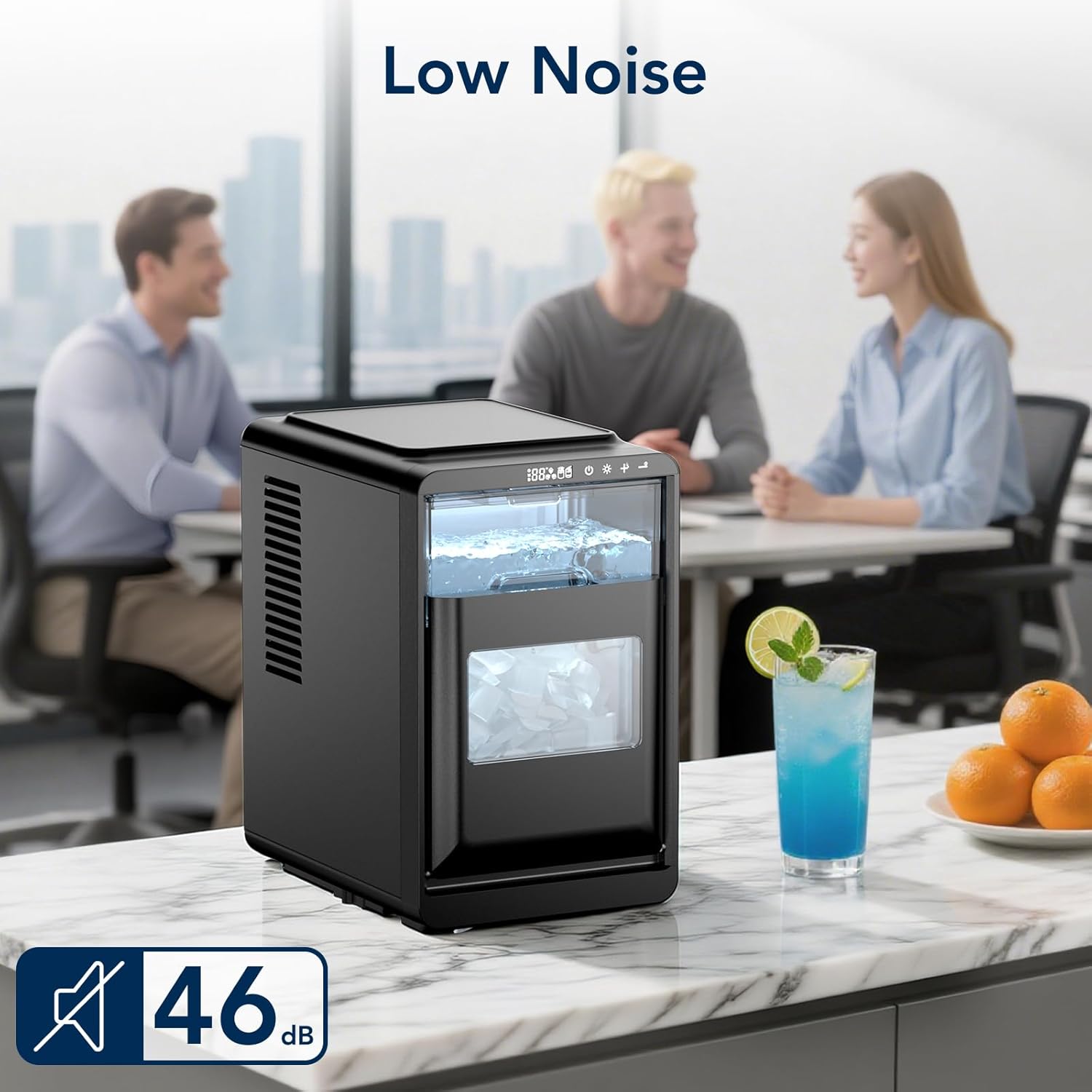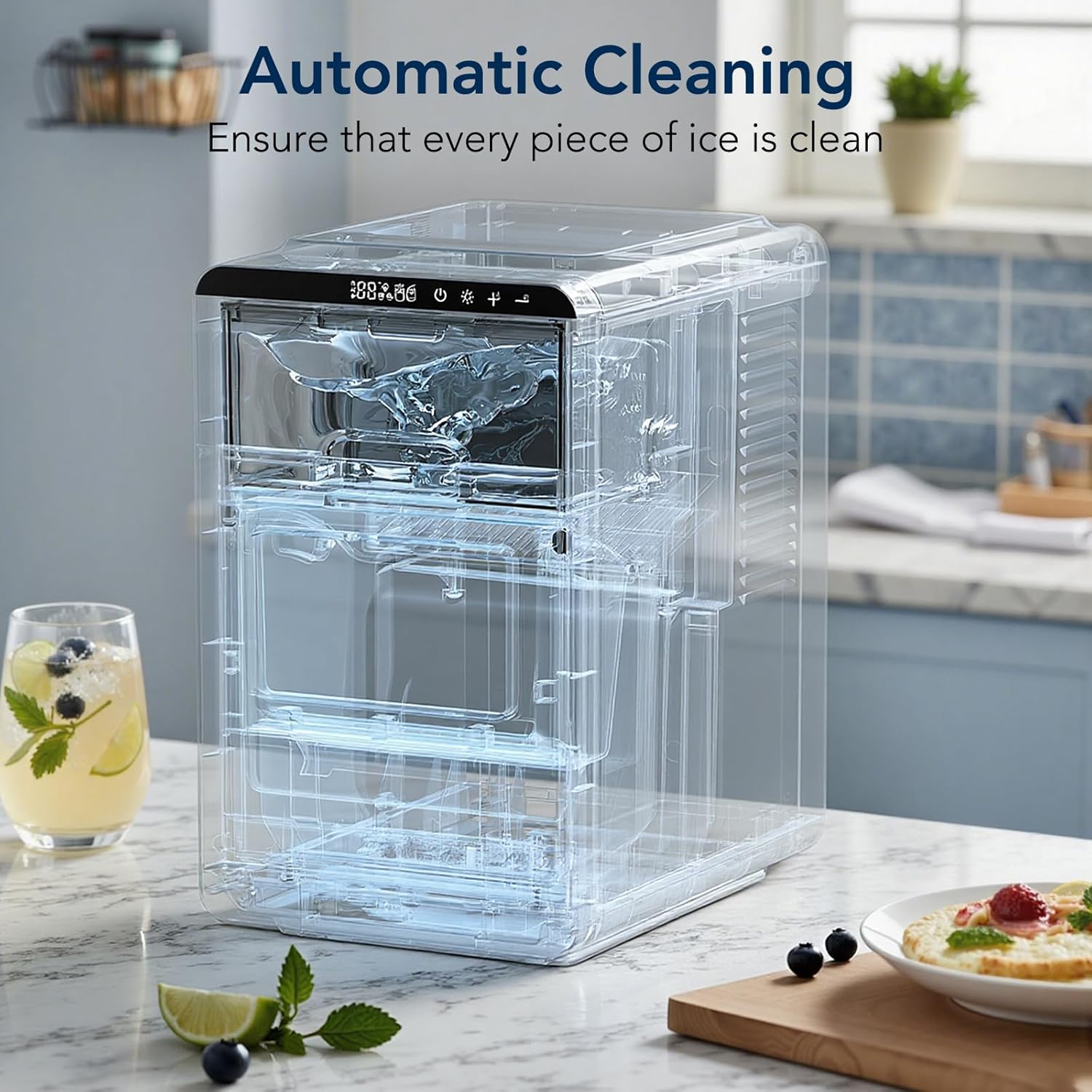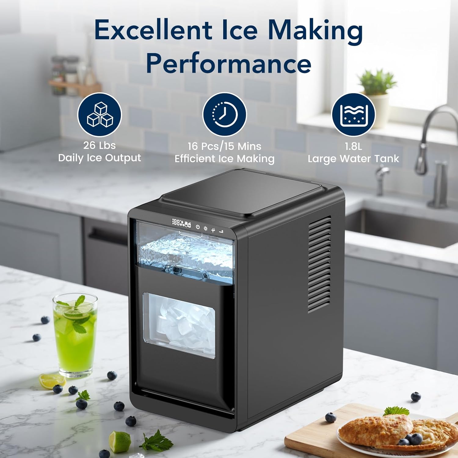 The ice maker can make 16 Crescent-shaped ice cubes in just 12 minutes. Fill 1.8L of water into the water tank maximum ice capacity can reach 26 pounds in 24 hours. Say goodbye to long waiting times and enjoy a constant supply of ice whenever you need it. It has a transparent window so you can watch the ice being made.