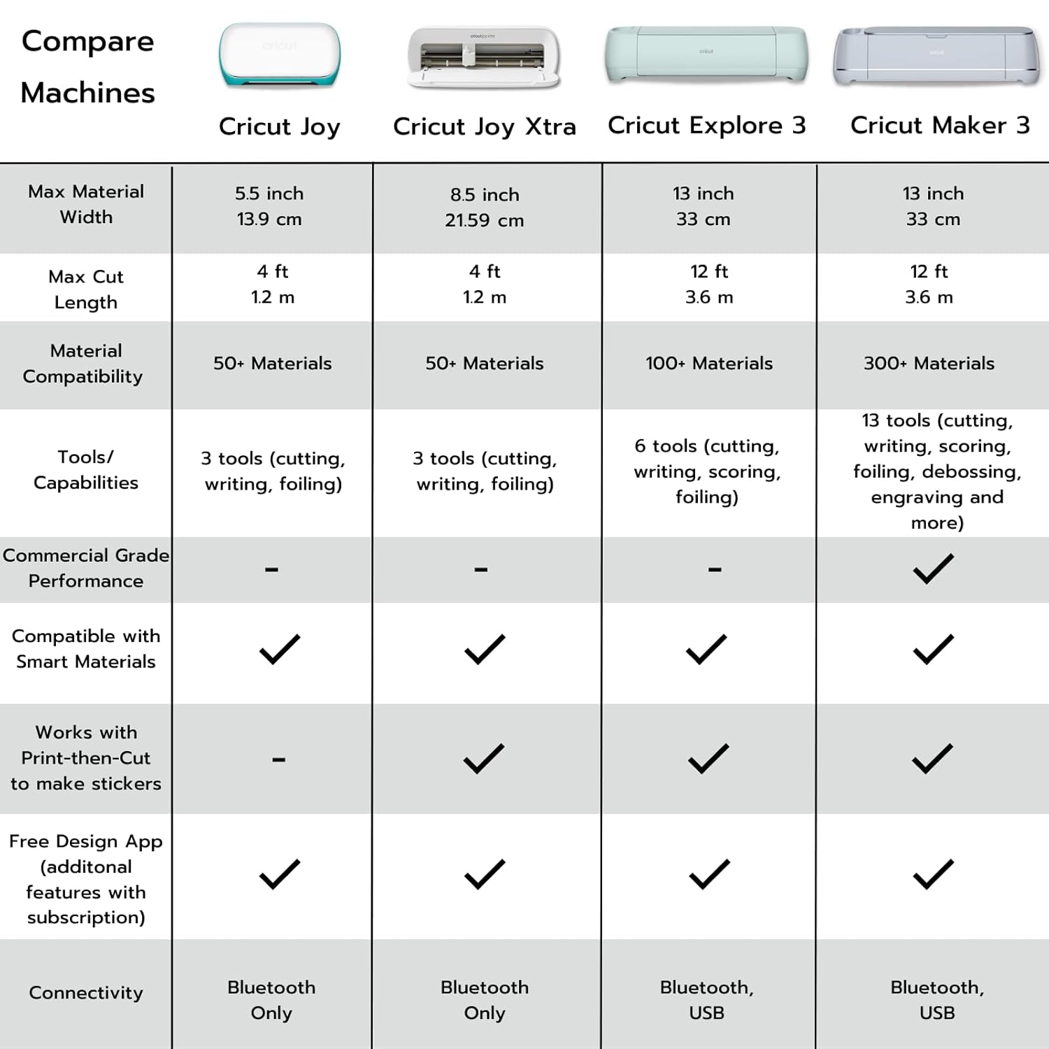 Compatibility: The Joy is the smallest and most compact of the Machine family. Working only with three tools this machine can write/draw foil and cut. In order for the Joy to function you must have a device with Bluetooth and high-speed internet. This machine does NOT have the capabilities to make printed stickers using the print-then-cut feature (check out the Joy Xtra for that). Operating system compatibility includes iOS Mac Windows (not 7 and 8) and Android.