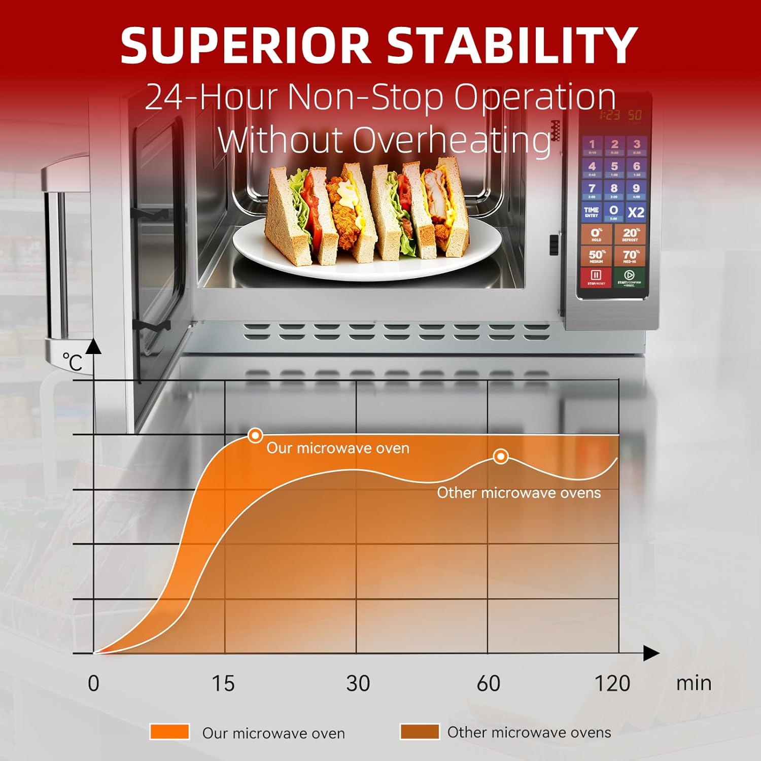 Superior Stability 24-Hour Non-Stop Operation:Durability is engineered into every part of this 34L model. Unlike smaller appliances that struggle with prolonged use, its designed to run non-stop for up to 24 hoursperfect for busy scenarios like weekend brunches with back-to-back recipes, small restaurants prepping ingredients from morning to night, or event catering where food needs to stay warm for hours. It stays cool to the touch even after long sessions.