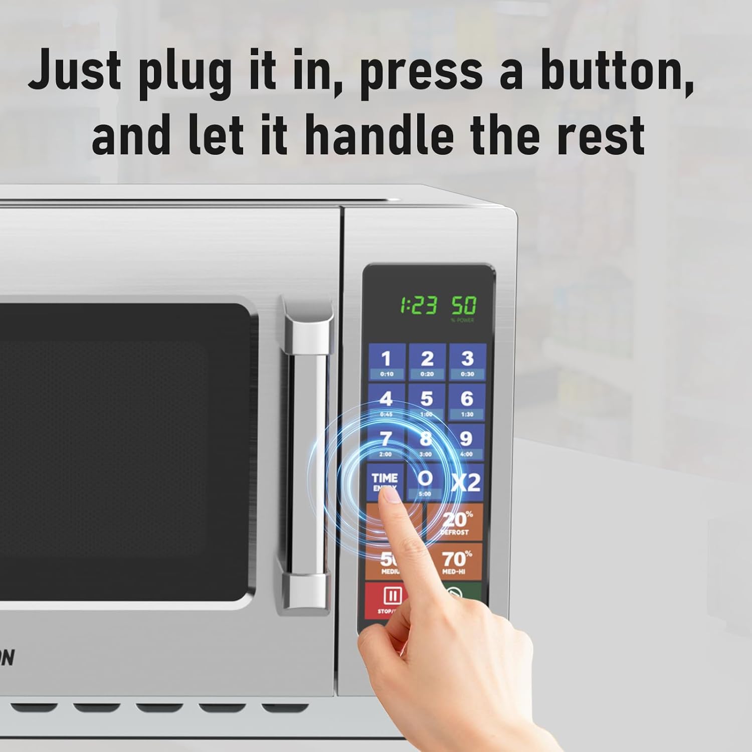1LED INDICATOR LIGHT2SIMPLE BUTTON CONTROLS3BRUSHED METAL HANDLE4CERAMIC TURNTABLE