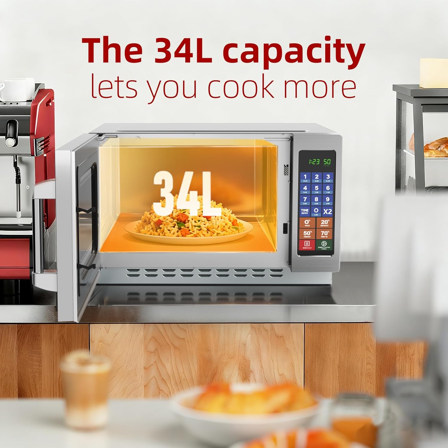 1000W High Power Rapid, Consistent Heating & Thawing:1000W delivers fast results and even heat distribution, tackling heating, thawing, and cooking with ease.its advanced heat circulation design ensures uniform temperature across the entire 34L space: no more overcooked edges or underdone centers, even when the appliance is fully loaded. Whether youre defrosting bulk ingredients or cooking a multi-component meal, every result is reliable and consistent.