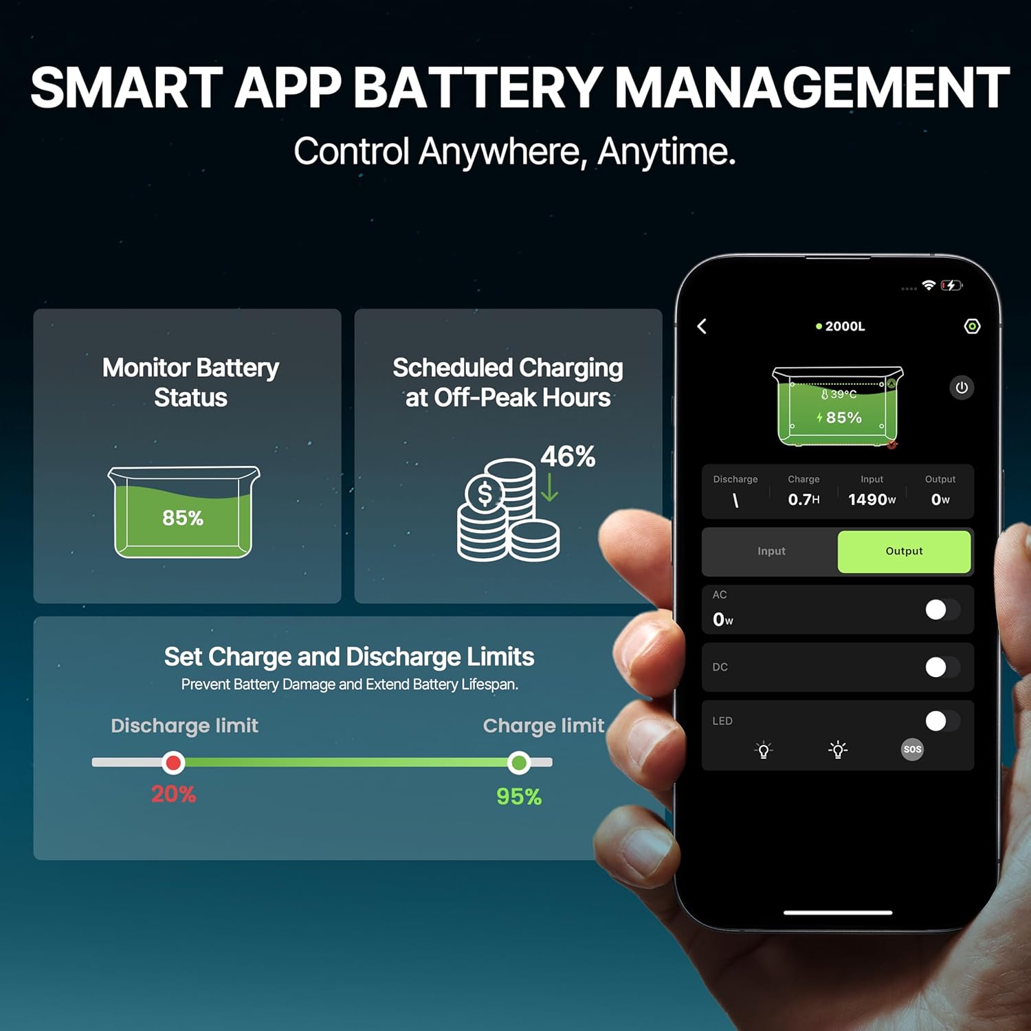 [1.3X Extended Runtime] Powered by semi-solid LiFePO4 cells and an AI-driven BMS 2000L delivers 1.3X longer runtimeideal for home job sites or the outdoors. Enjoy 2048Wh of stable power with 4000+ charge cycles and 10+ years of performance. 56+ protection layers and thermal control ensure long-term safety and durability.