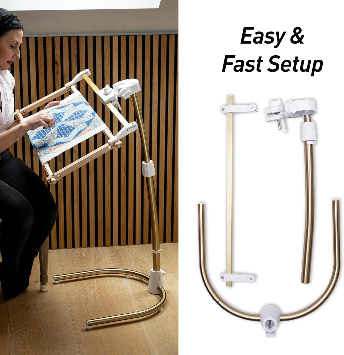The perfect partner for needlework! with its strong JAW the stand holds your frame or hoop firmly in position. The unique swivel system allows you to lift and rotate the frame 360 degree at anytime. Quick to assemble it is ready to use in seconds and folds away for easy storage. Practical stable height adjustable...stitch smarter with ! (frame and wooden parts not included)