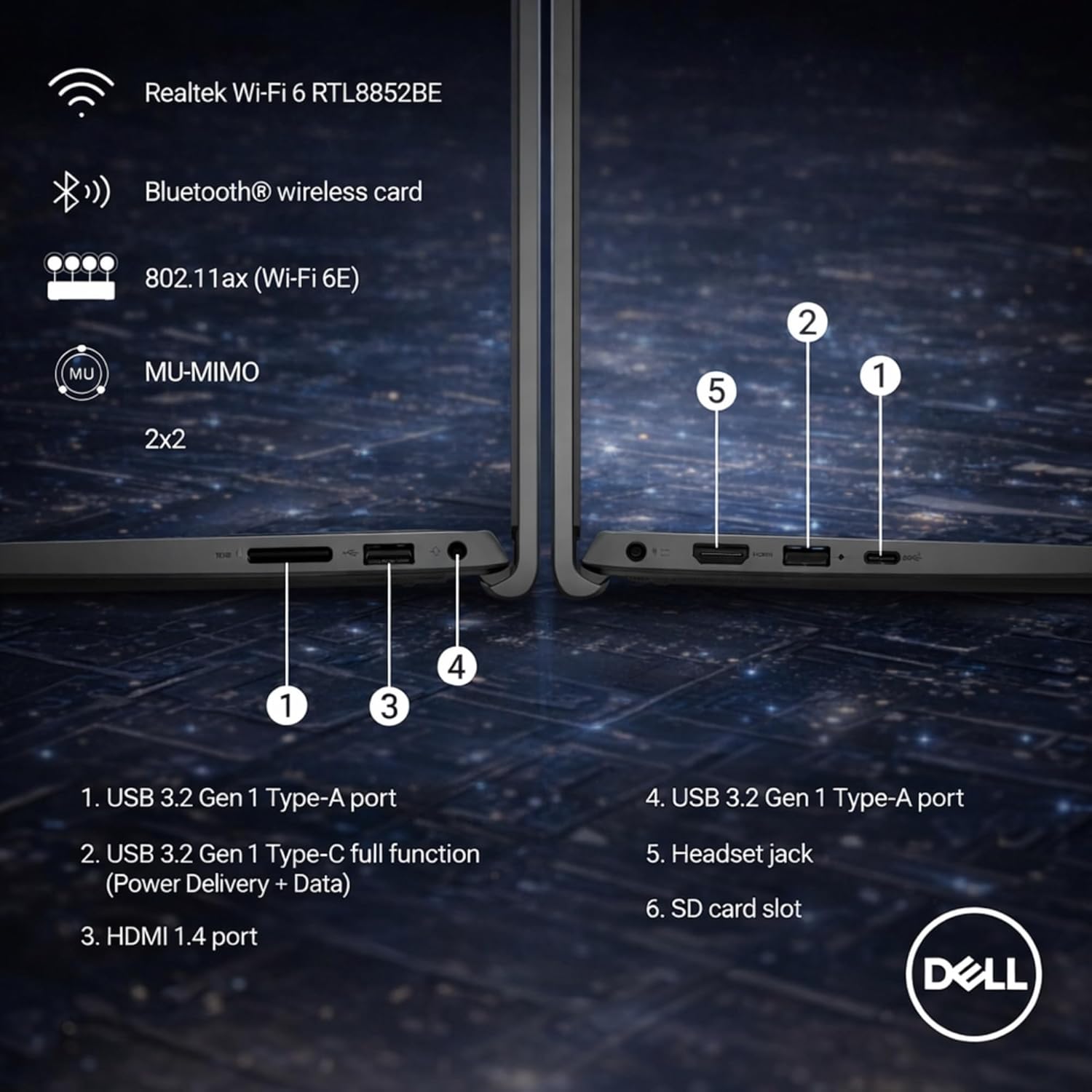 Processor: 13th Generation Intel Core i5-1334U (12MB Cache 10 cores 12 threads 4.60 GHz) Processor Graphics: Intel UHD Graphics Operating system: Windows 11 Home Memory: 12 GB DDR4 Hard Drive: 512GB Storage (256GB PCIe SSD + 256 External) Display: 15.6-inch FHD (1920 x 1080) Anti-Glare LED Backlight Touch Narrow Border WVA Display Connectivity: Wi-Fi 6 + and Bluetooth 5.0 Audio and Speakers: Dual Speaker Keyboard: US English Full Size Keyboard Built-in HD Webcam: Integrated 720p Webcam Ports: 1 x USB-A 2.0 1 x USB-A 3.2 1 x USB-C 3.2 1 x HDMI 1.4 1 x Headset Jack 1 x SD Card Reader Battery: 3-Cell 41Hr Battery up to 9 hours Color: Black Dimensions L x W x H (inches): 14.11 x 9.27 x 0.75 Weight: 3.66 lbs