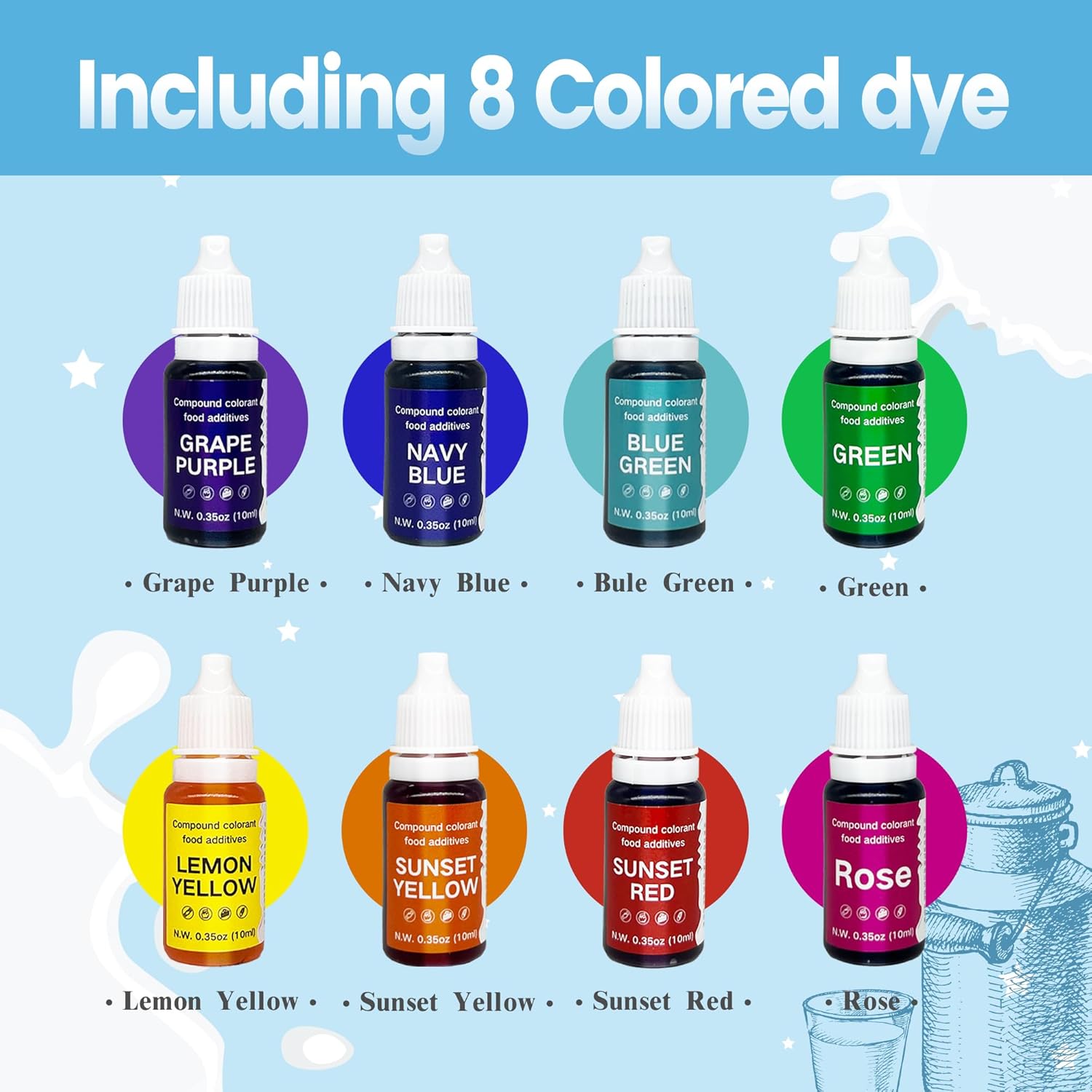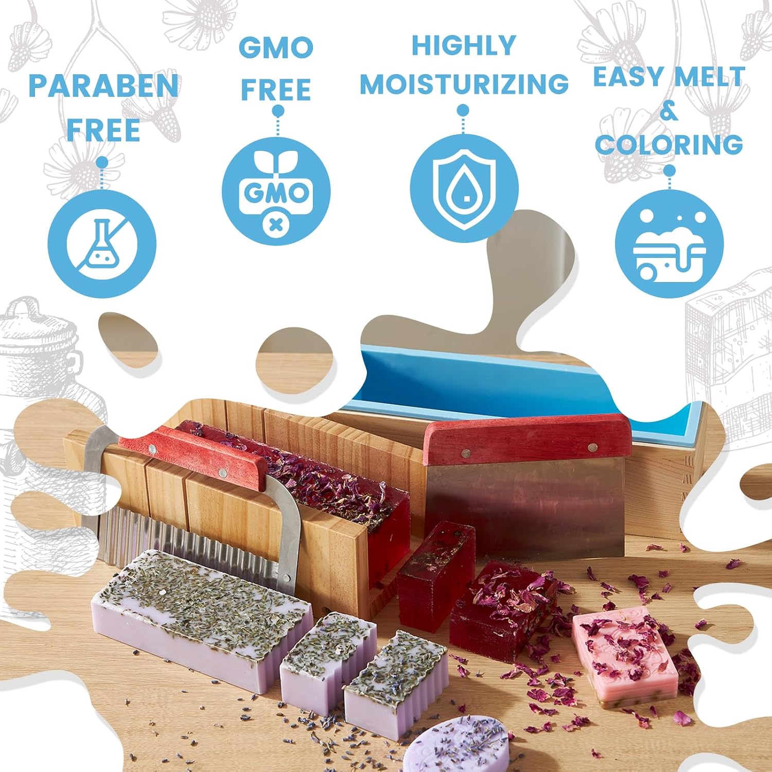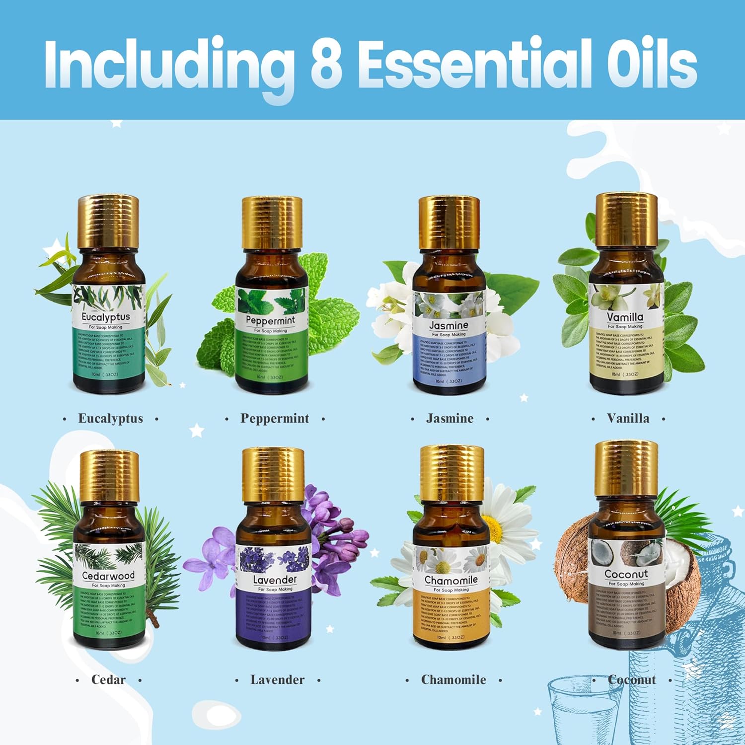 : Electric soap melting machine x 1 wodden spoon & steel spoon x each 1 250g gost milk soap base x 10 liquid dyes x 8 essential oils x 8 silicone mold x 3 loaf mold x1 cutting box x1 clear soap bag x 50 paper soap bag x 20 soap wrappers x 10 wavy & straight cutter x1 stir stick x 5 alcohol bottle x1 disposable cup x 10 soap sticker x 30. All you need to make soap are included