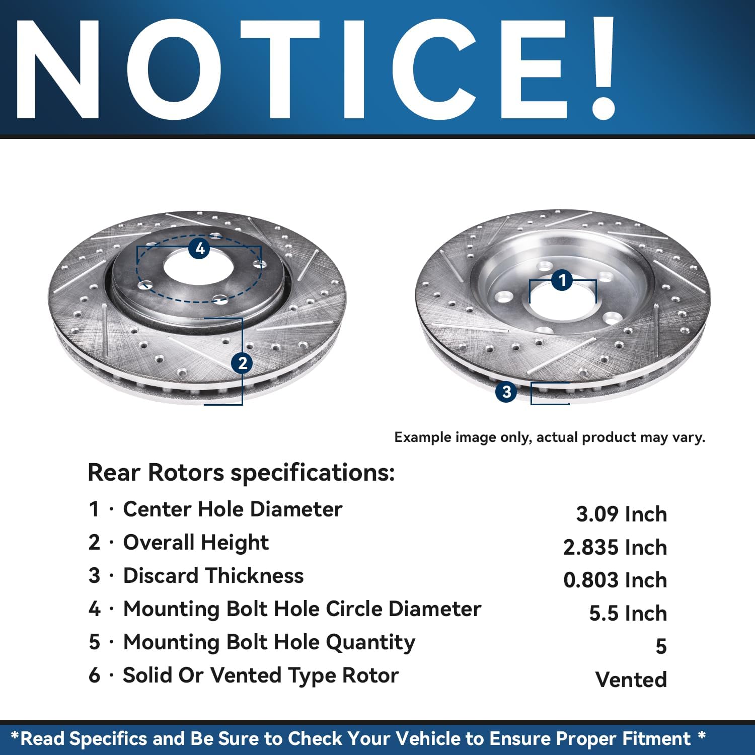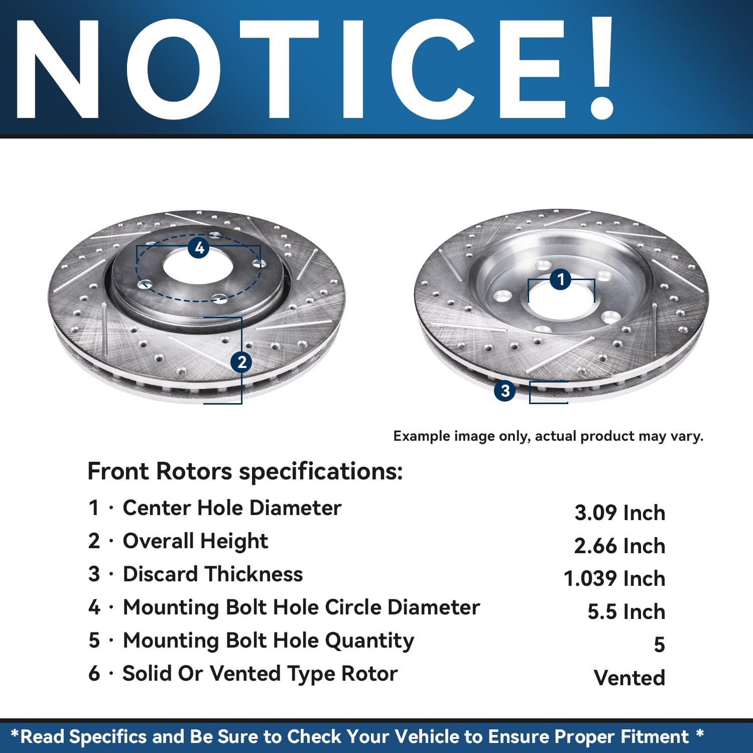 Brake Pads and Rotors Kit Includes: 2x Front Drilled & Slotted Disc Brake Rotors + 2x Rear Drilled & Slotted Disc Brake Rotors + 2x Front Ceramic Brake Pads with Hardware + 2x Rear Ceramic Brake Pads with Hardware