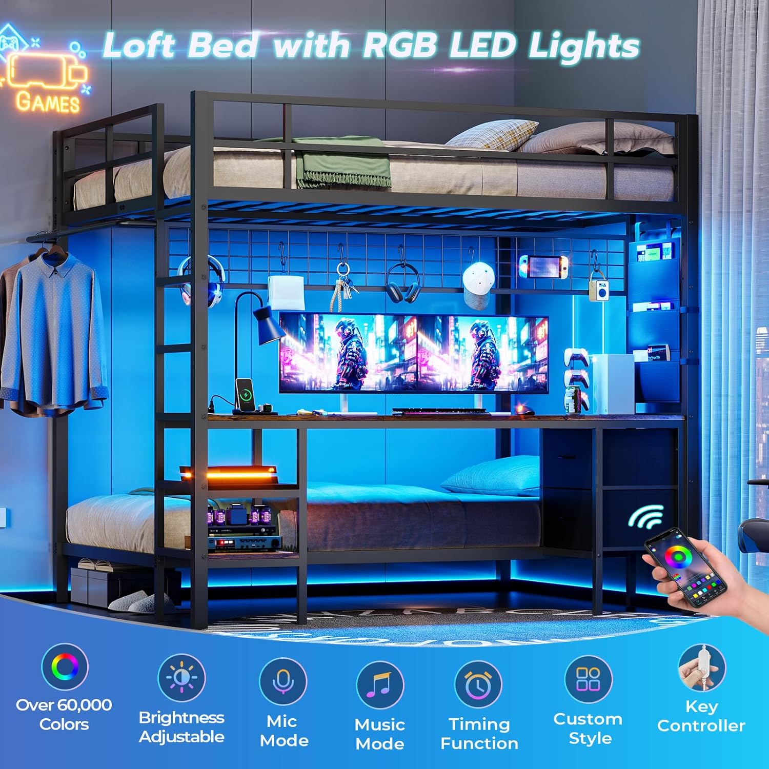 Full over Twin size bunk Beds With LED LightsThe vibrant RGB LED lights(over 60000 colors), in addition to directly adjusting the light colors in the APP or line controller, you can customize the brightness, dynamic mode,music sync mode, mic mode, and timing modes by app to create a dreamy and colorful bedroom atmosphere for your child.Have a party in your bedroom!