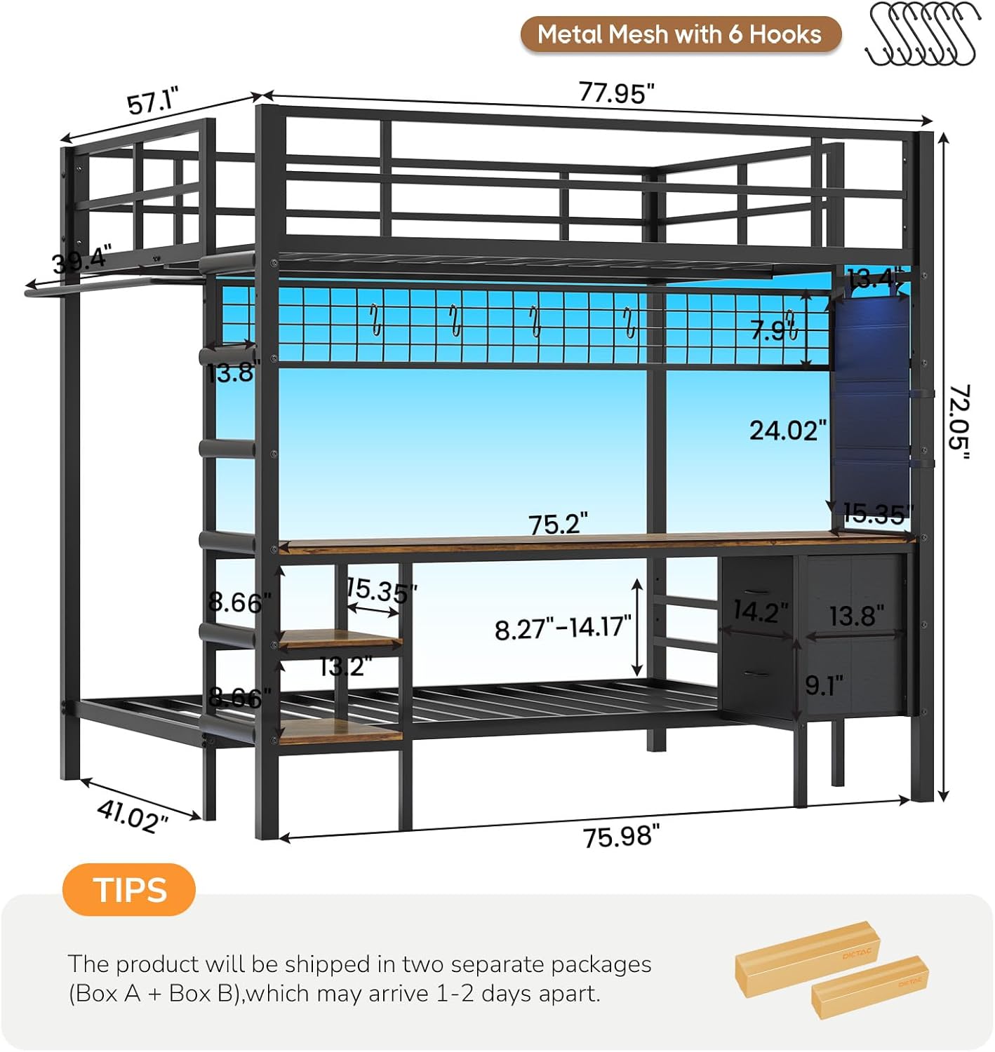 Bunk Bed with Desk and Outlets full/twin bunk bed comes with a study desk and charging station. While satisfying rest, create a productive, simple work, study or gaming area for your child, ideal for adults and teens. You can also move the metal mesh to the outside,and then put the side with the metal mesh against the wall, and turn the desktop into a bookshelf, or still use it as a study table, so you can study or work while sitting on the bed. Perfect for space-saving needs.