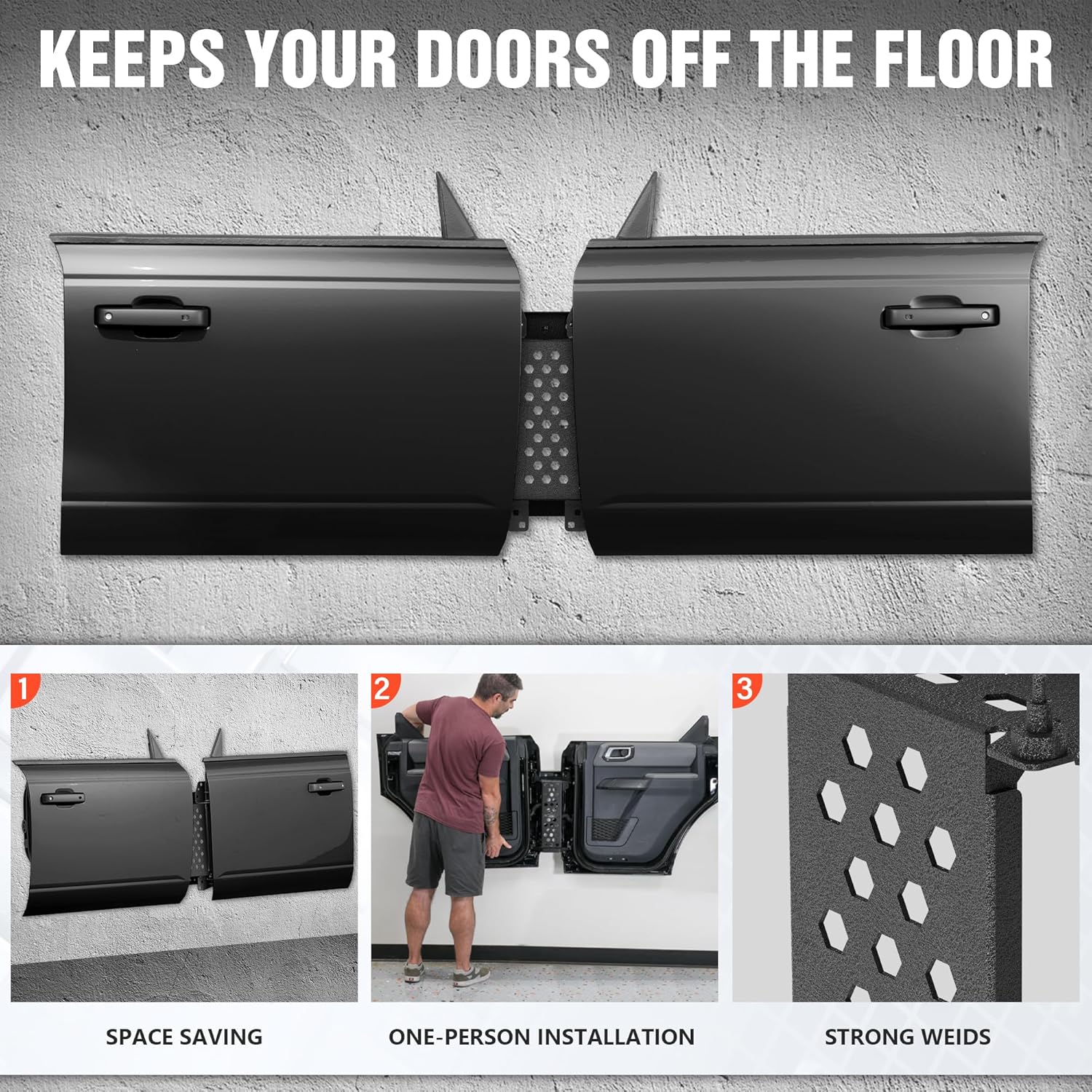 Smarter & Safer Storage Design: Unlike other systems that leave your door's painted exterior exposed the Door Storage Rack stores your Bronco doors with the painted side facing the wallprotecting them from accidental bumps scratches or damage caused by bikes tools or daily garage traffic. Thoughtfully engineered so you can remove and store your doors directly and safely in one smooth motion.