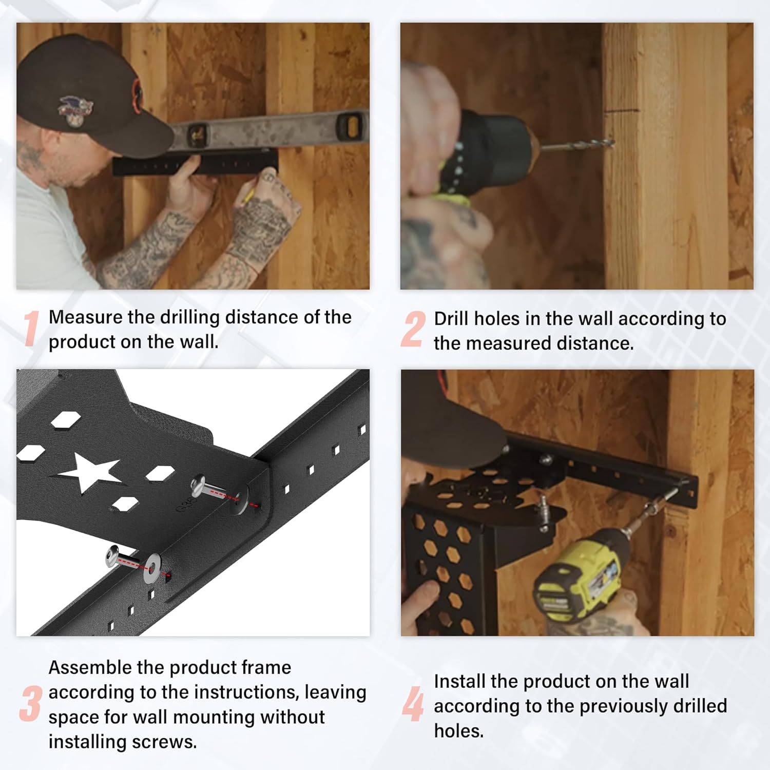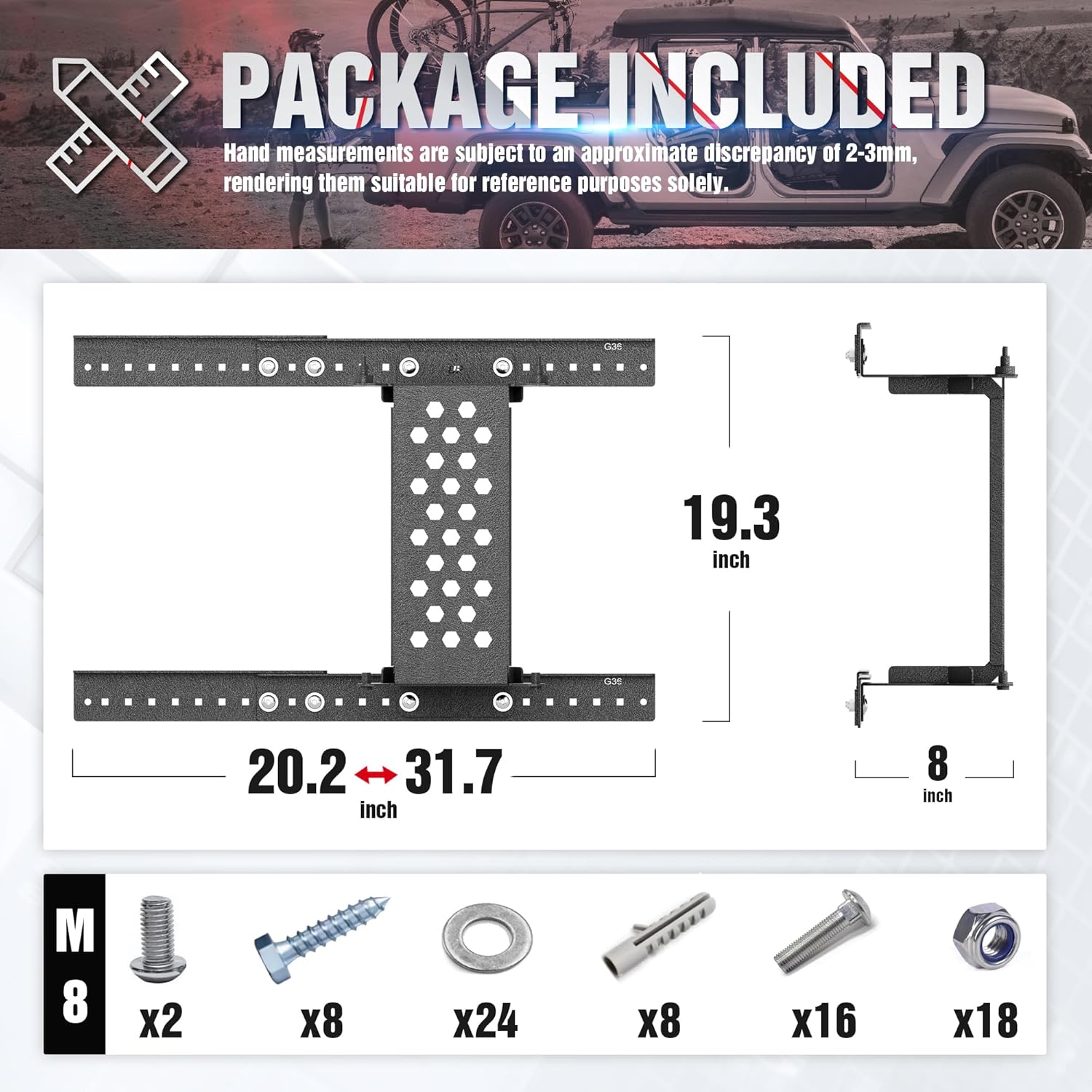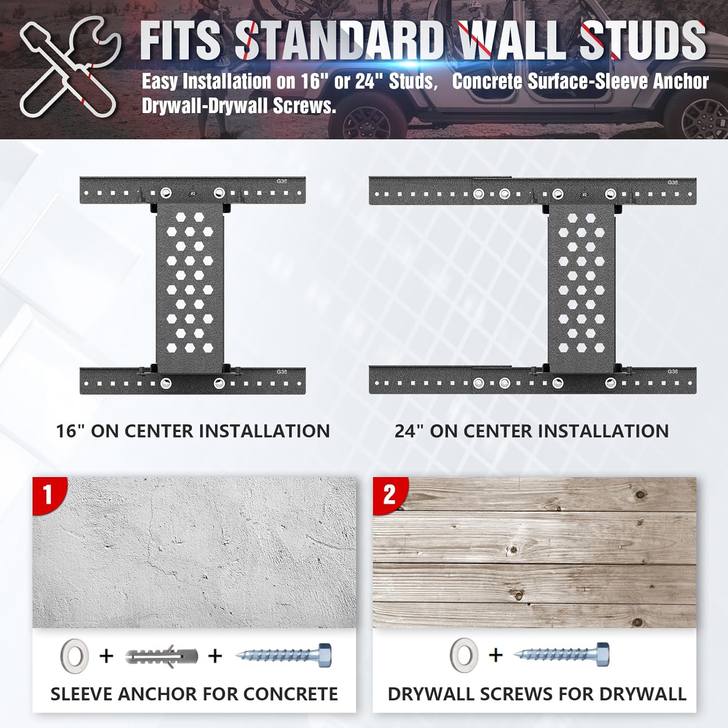 Easy to Assemble & Wall-Mount Ready: The Door Storage System is designed for quick and hassle-free assembly. It comes with all necessary hardwareno extra tools or parts required. We've even included additional brackets to fit both 16" and 24" wall studs. For safety and stability be sure to mount the system directly to wall studs to support the weight of your Bronco doors securely.