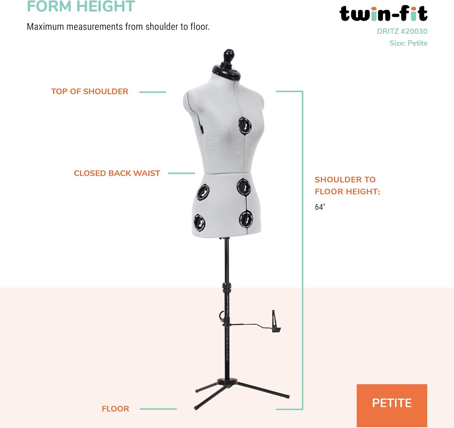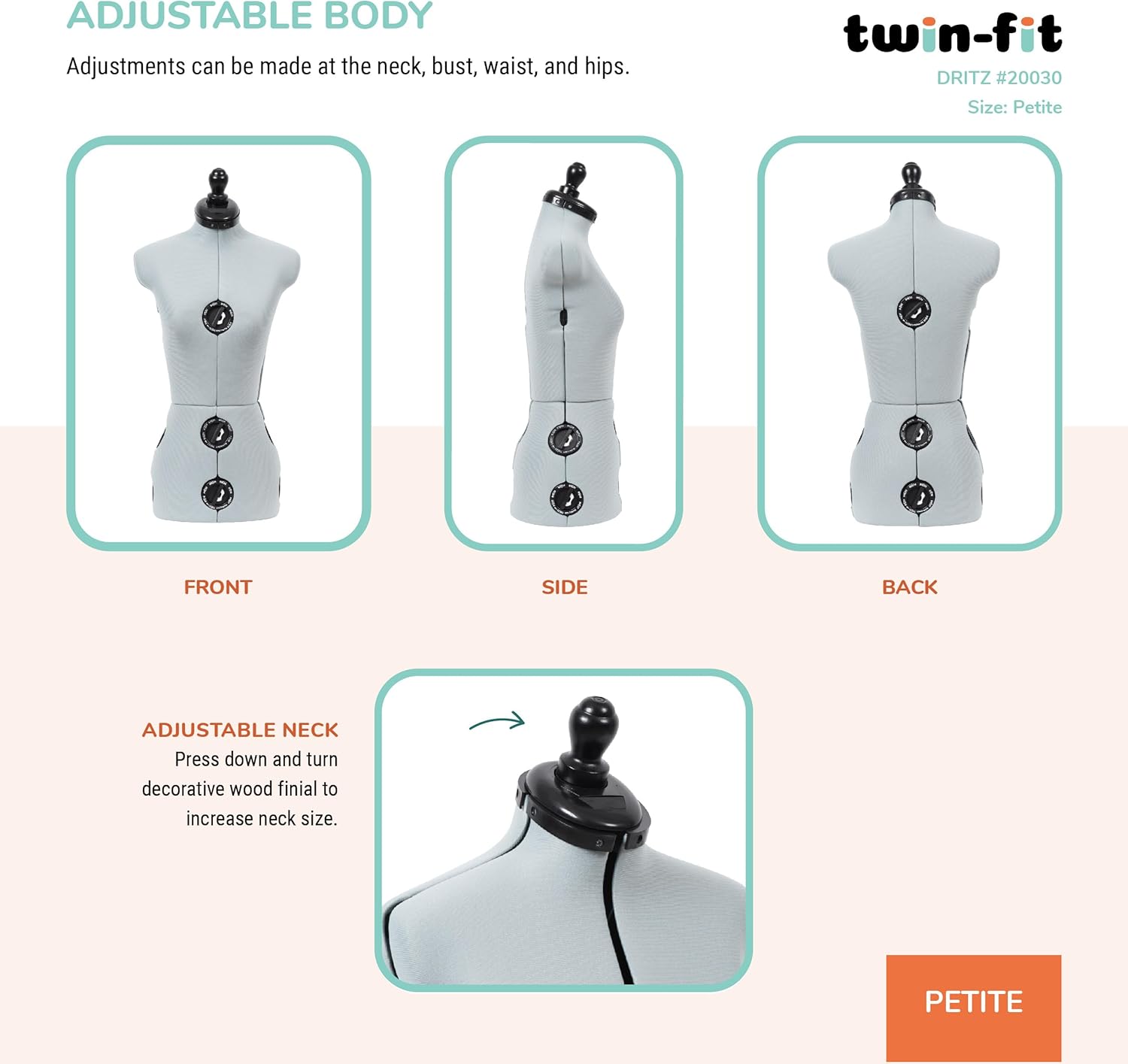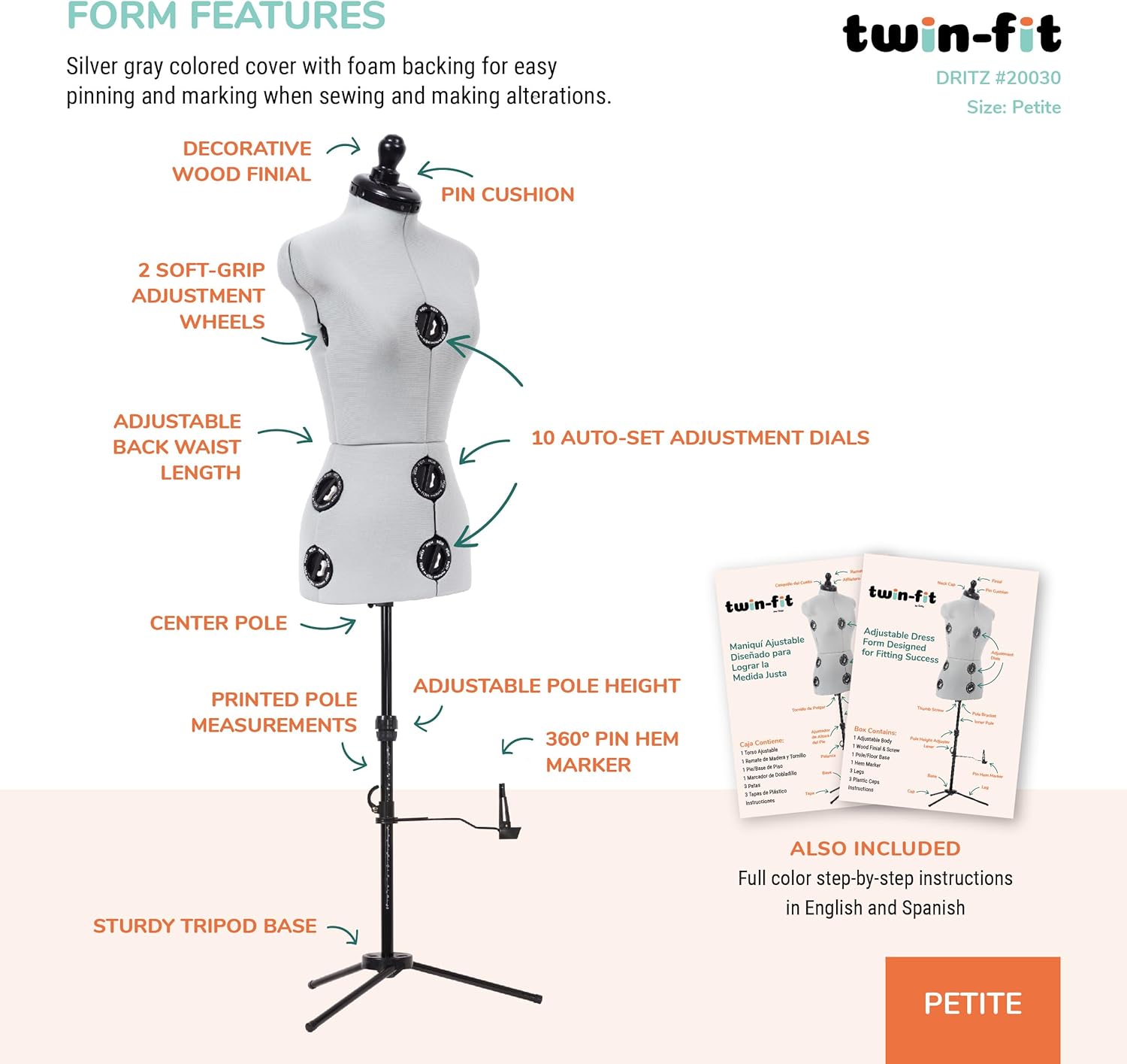 The Twin-Fit dress forms provide the seamstress with a body twin that matches their body size and assists with the fitting construction and alterations of garments. The forms fabric is a silver gray color with polyester fabric and foam backing for easy pinning and marking when making fitting construction and garment alterations.