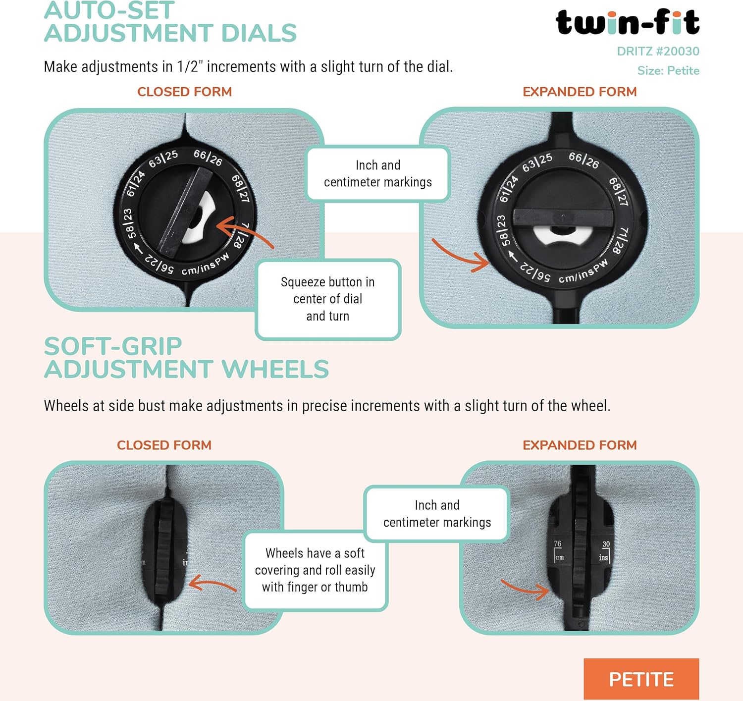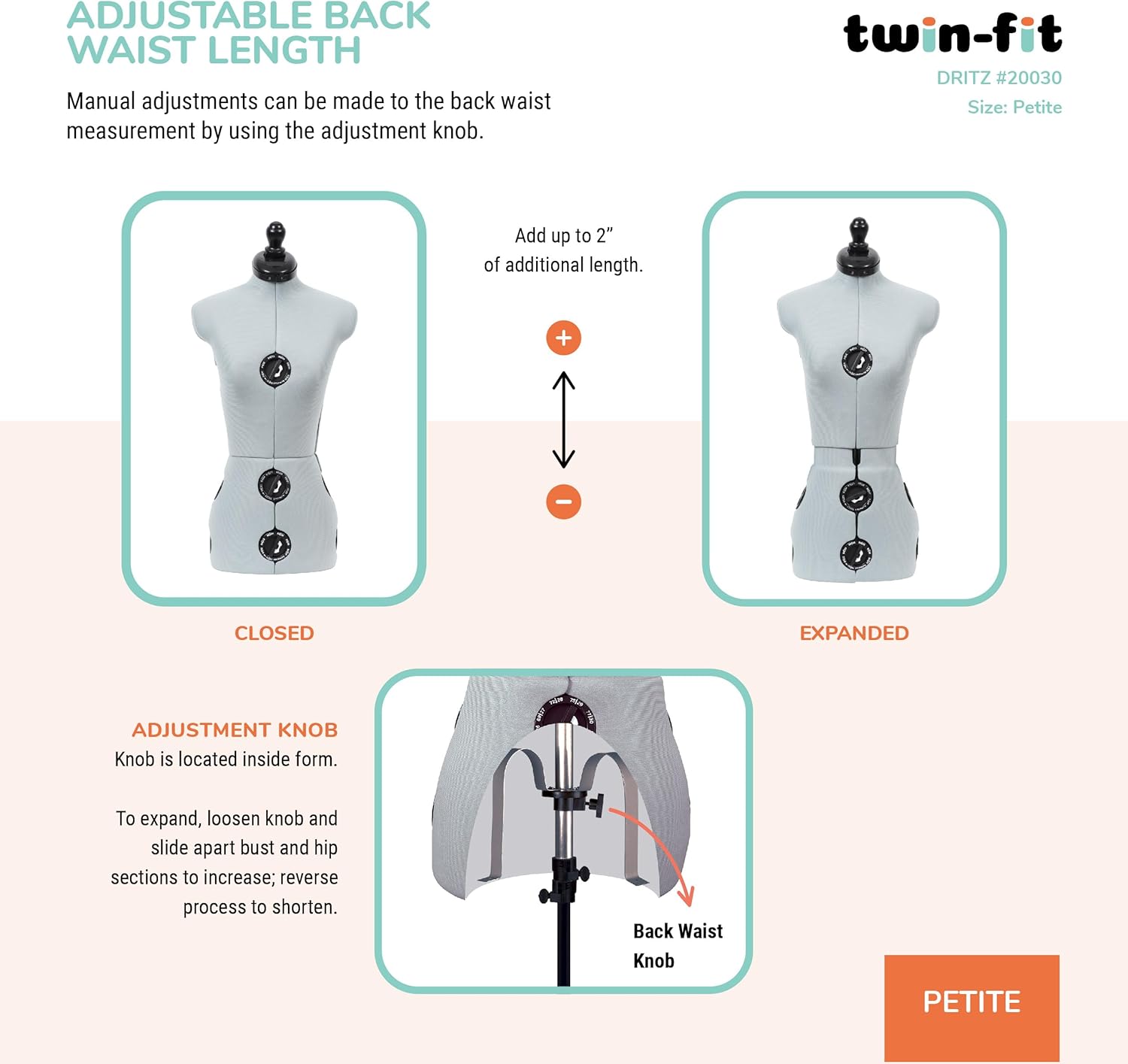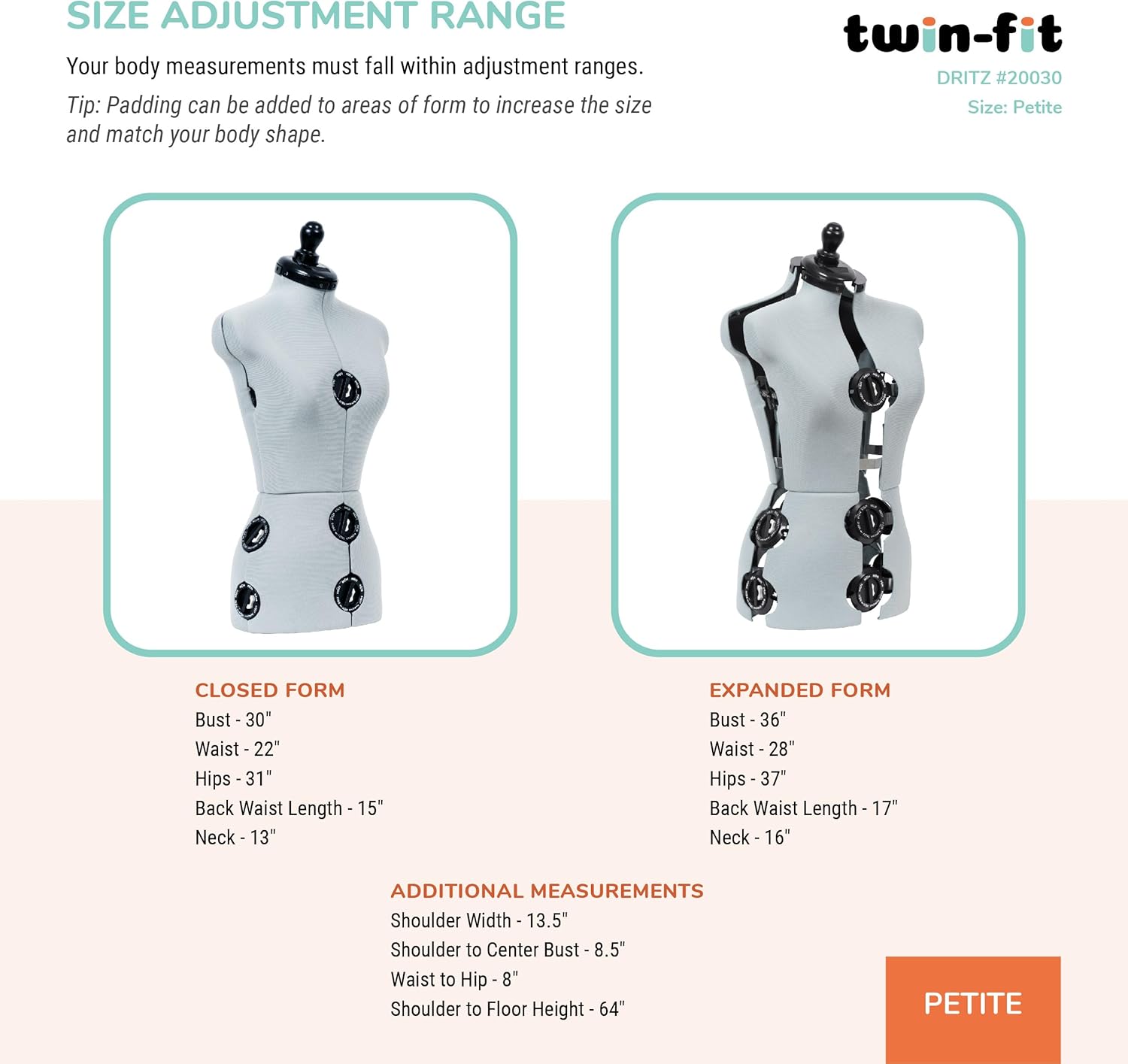 The Twin-Fit dress forms provide the seamstress with a body twin that matches their body size and assists with the fitting construction and alterations of garments. The forms fabric is a silver gray color with polyester fabric and foam backing for easy pinning and marking when making fitting construction and garment alterations.