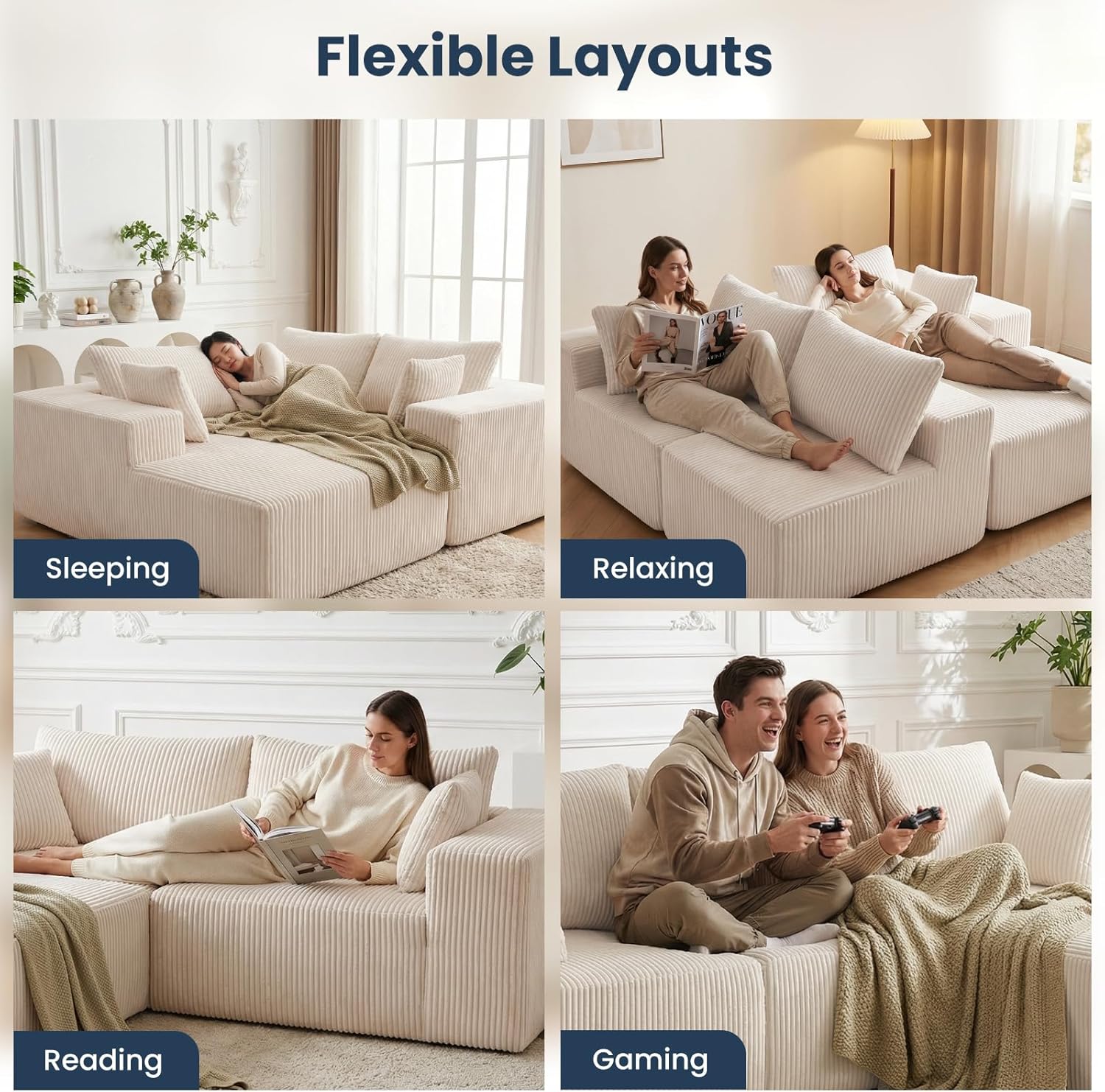 Comfortable Sectional Couch The cloud couch is made of skin-friendly, breathable, and stain-resistant corduroy fabric, designed with high-resilience foam for superior support and long-lasting durability with 3 removable back cushions and 2 throw pillows, providing you with a super comfortable experience. The anti-slip design at the bottom ensures the stability of the sofa. The comfy sofa cover is machine washable and can be cleaned when dirty.