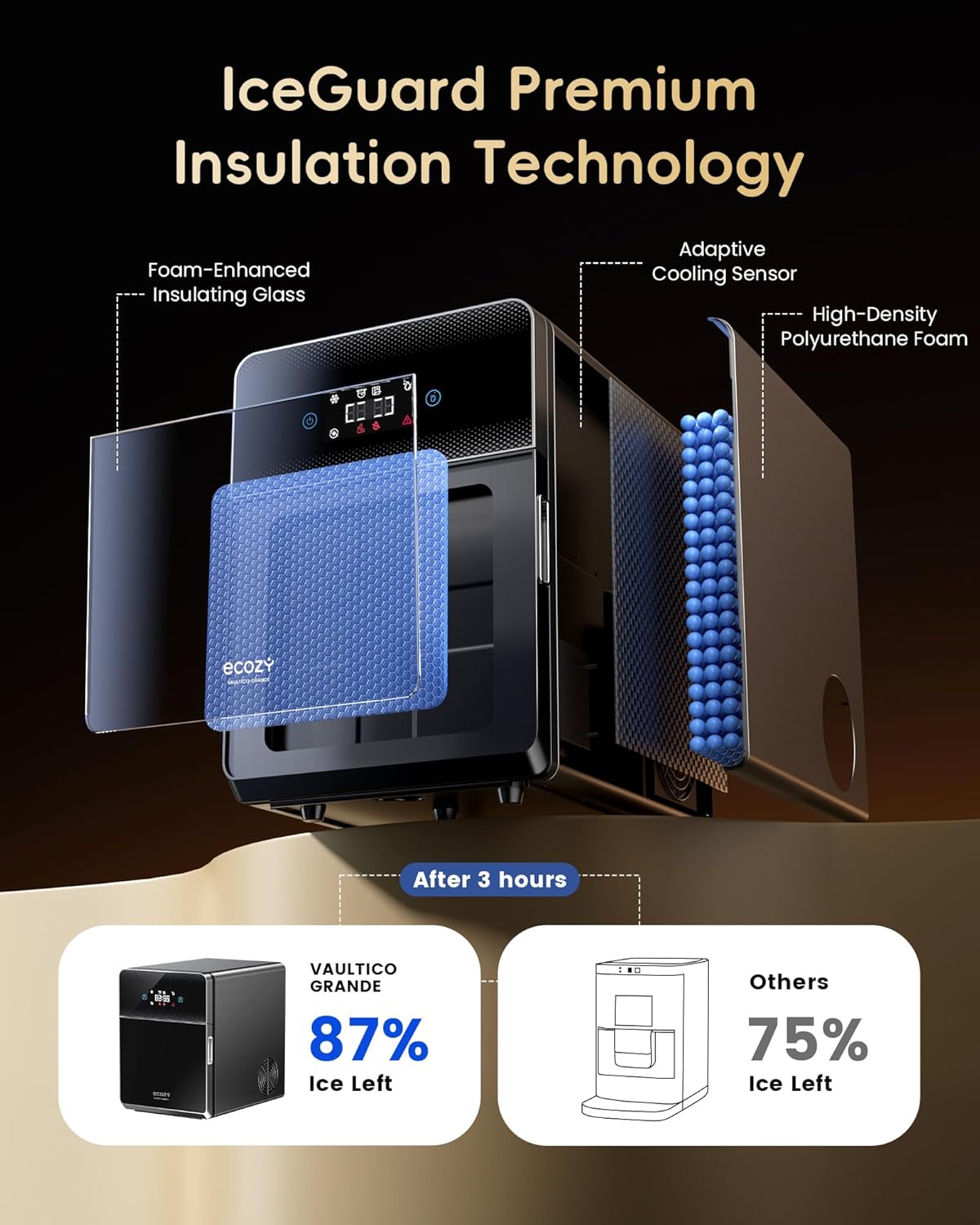 Tech-Driven Insulation: Our exclusive GlacioLock technology activated when the basket is full combines with double-layer insulation to cut melt by 13%keeping your whiskey chilled longer for a smoother undiluted taste every time