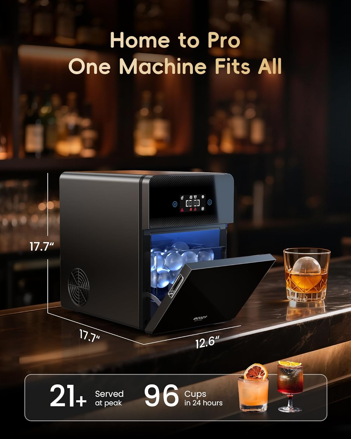 Premium Ice Ball Always Ready: Produces up to 96 large ice spheres per day storing 45 at onceideal for bars serving 2025 guests. Not a refrigerator; short-term storage may melt so transfer ice to your freezer for over 24h