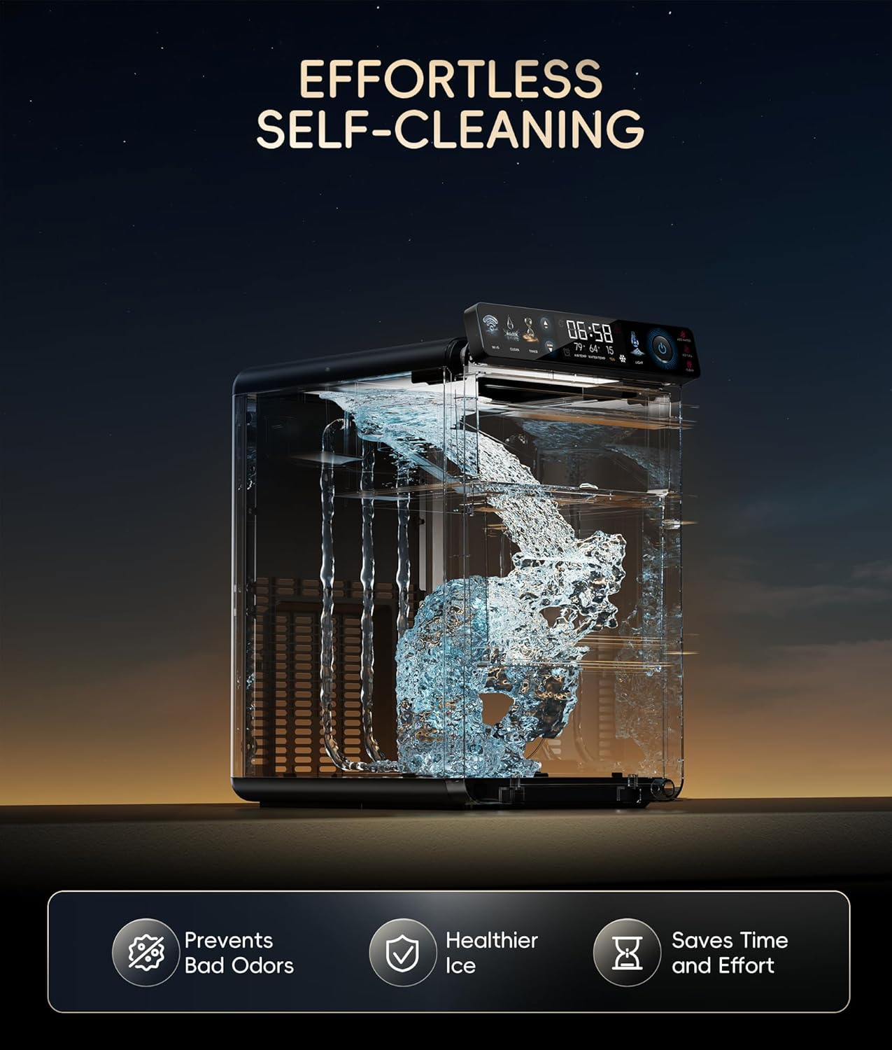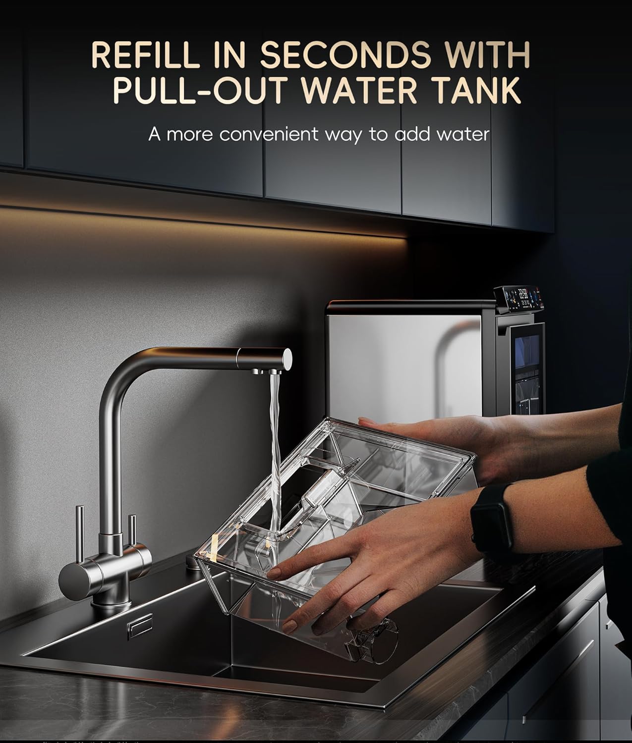 & : Enjoy effortless refilling and cleaning with the pull-out water tank. The removable basket makes transferring ice simple and tidy