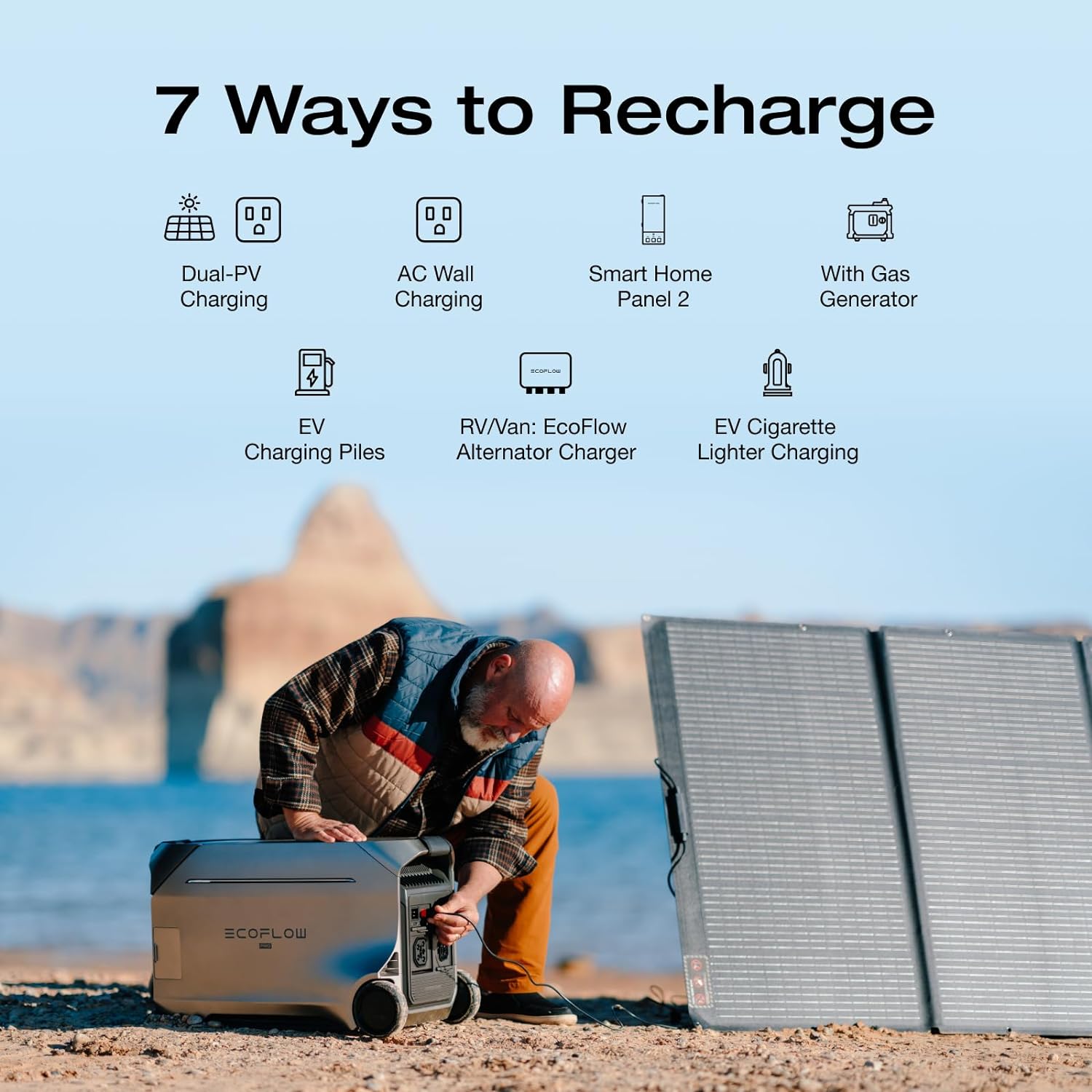 Forget Refueling. Featuring a 4096Wh LFP battery capacity expandable to 48kWh with extra batteries or smart generators providing 2-4 days of whole-home backup power. With 7 unique and 18 combo charging methods like AC wall outlets solar panels gas generators EV charging piles or the EcoFlow smart home panel 2 you can forget fuel worries.
