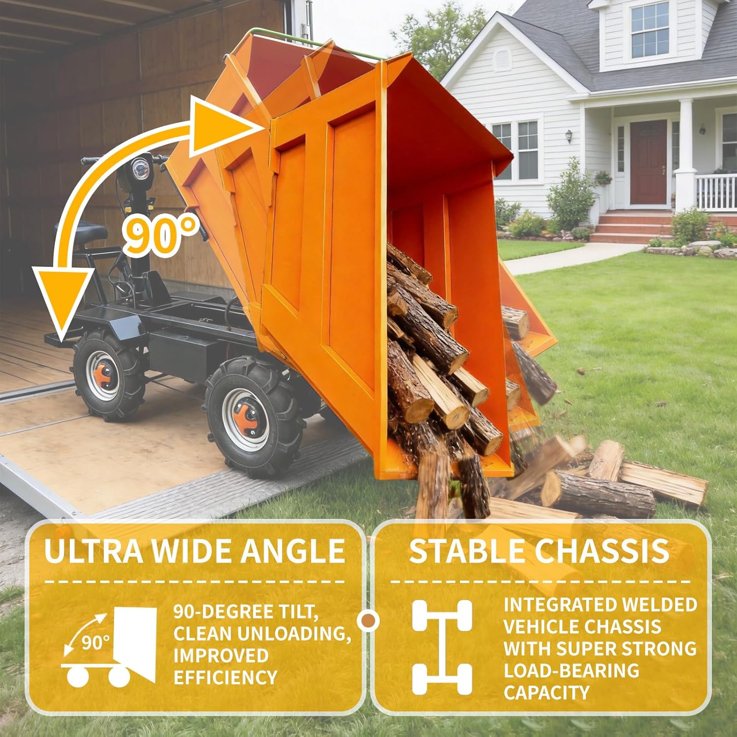 All terrain adaptation suitable for various scenarios It can climb a 30 degree slope perfectly adapting to the needs of workers farmers and gardening enthusiasts; The 90 tipping bucket design is suitable for unloading various materials saving time and effort.