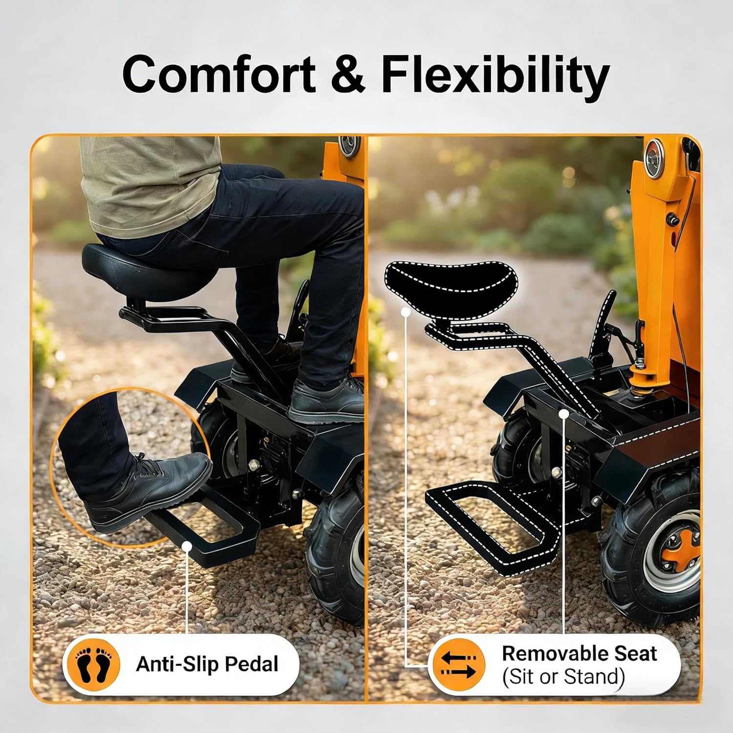 3-in-1 Driving Modes & Adjustable Speeds Choose from standing seated or walking modes to suit different tasks. Forward speed is adjustable from 0-15 km/h (2 levels) while reverse offers 0-5 km/h (2 levels) giving you full control based on your needs.