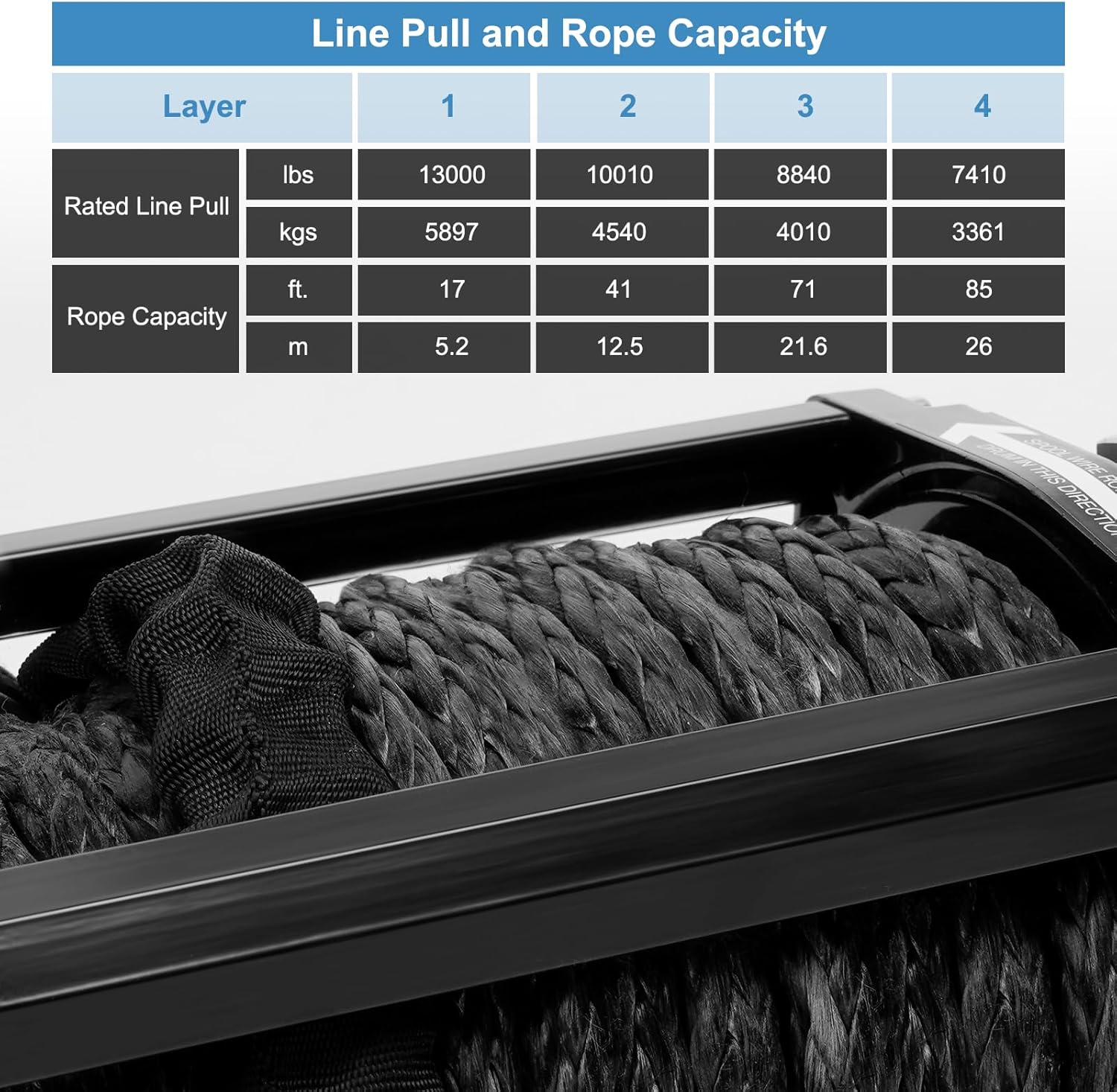 CHOSEN MATERIAL: The DC winch is provided with a 12-strands braided rope with high tensile strength. The clevis hook is forged with our frosting process to prevent the winch for truck from rusting and corroding. The pure copper motor and 500A solenoid valve are all our dedication to this 12V winch.